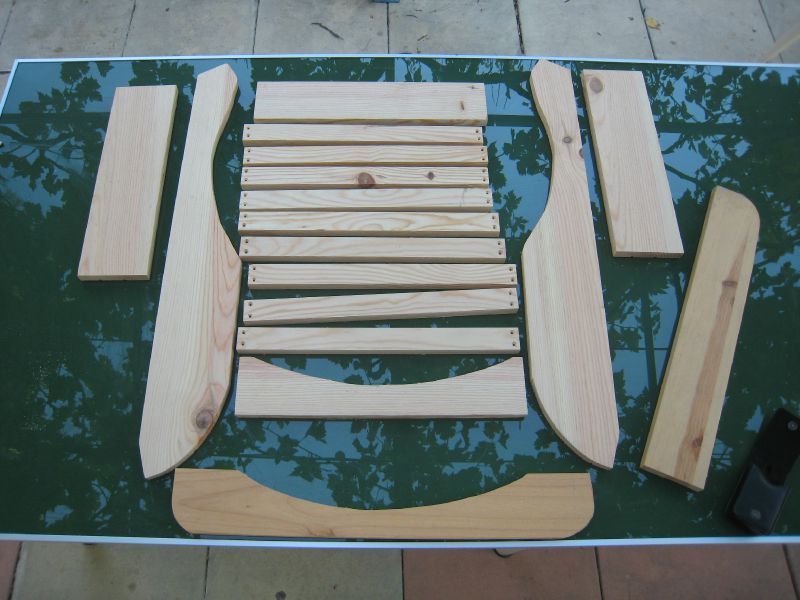Les pièces de l’assise. J’ai utilisé du plancher de pin déclassé, après avoir enlevé la rainure et la languette.