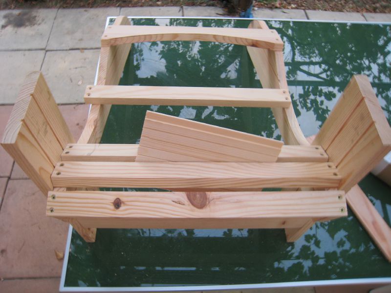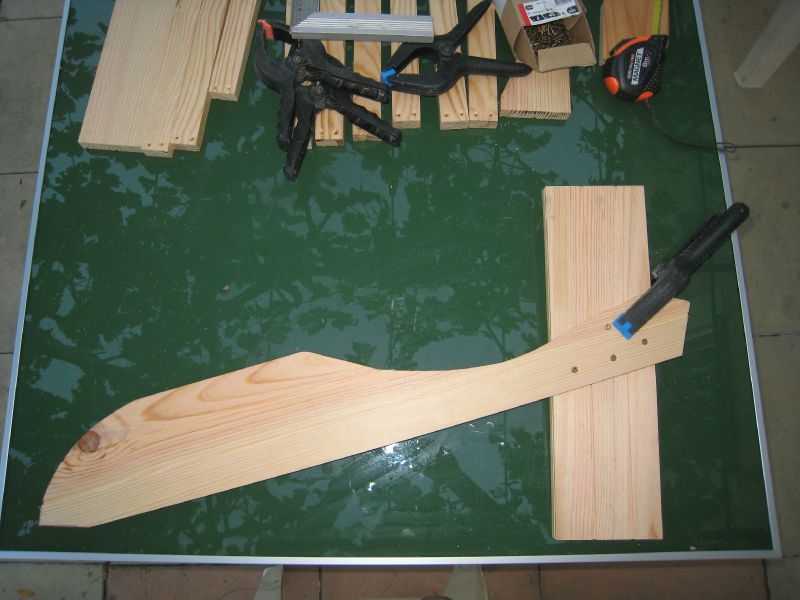 On peut ensuite assembler le dossier. J’ai utilisé des lames de lambris légèrement cintrées chutes du support de hamac, mais il n’est pas nécessaire qu’elles soient cintrées (voir article support de hamac)