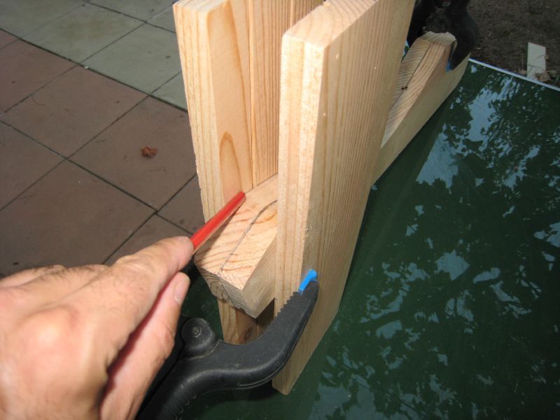 La planche support du dossier doit aussi recevoir l’accoudoir. Comme celui-ci est horizontal il faut raboter l’arete de la planche afin de créer une surface d’appui horizontale.