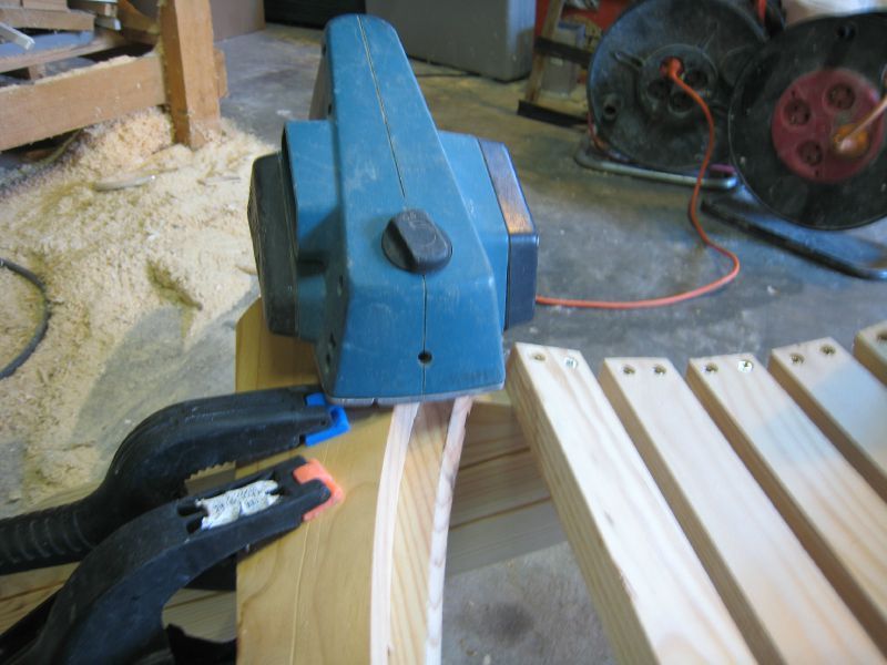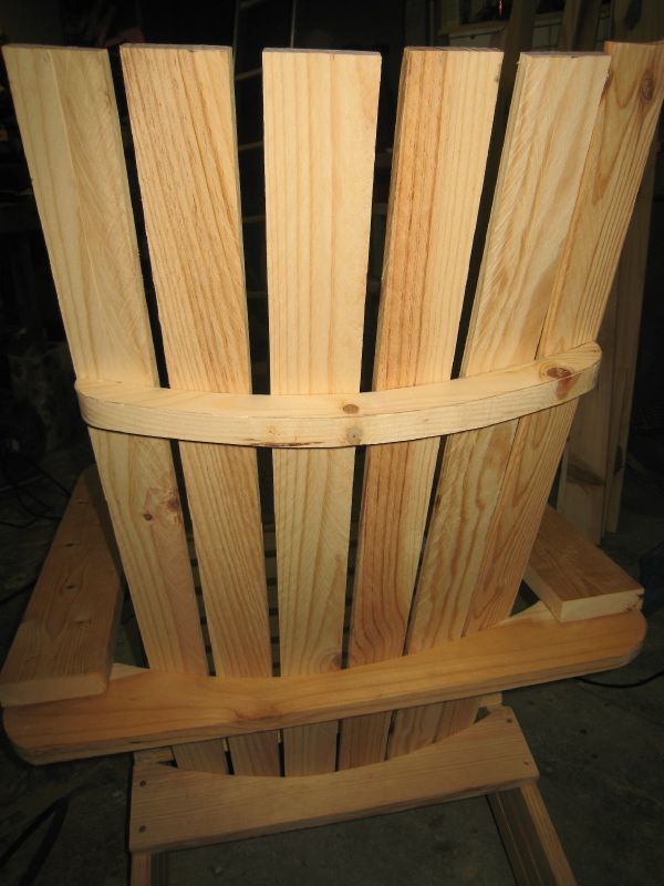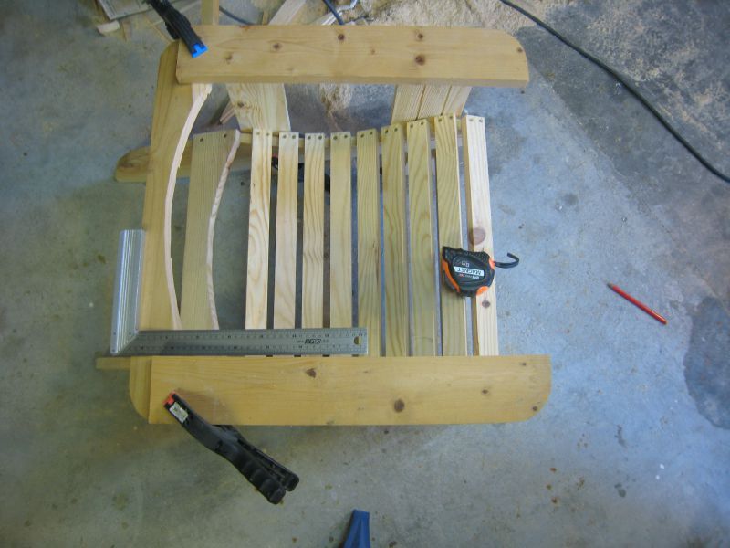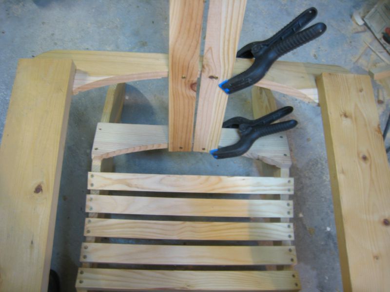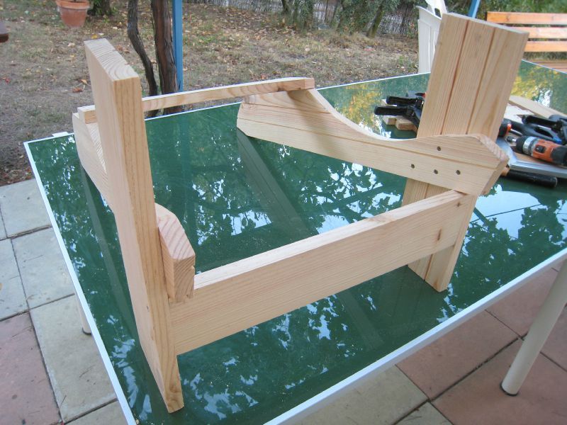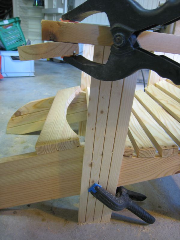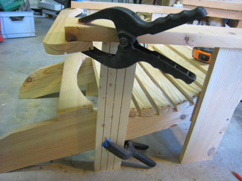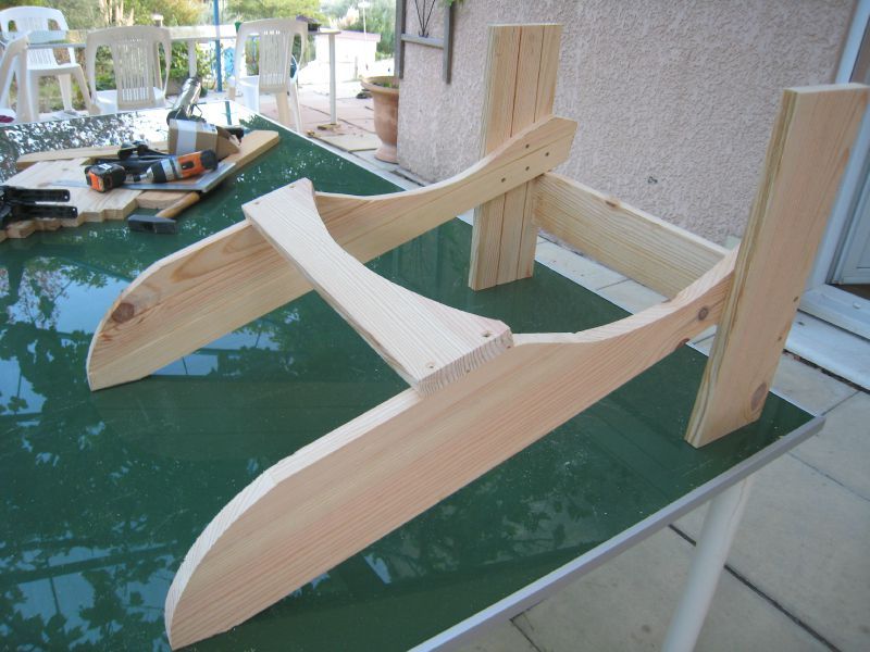 J’avais fait une première version similaire à celle proposée par Eric, mais nous avons trouvé le dossier inconfortable et je l’ai modifié pour remplacer le dossier plan en planches épaisses en dossier cintré en lambris (les chutes de mon support de hamac) plus flexible.