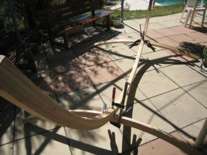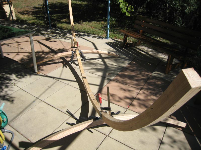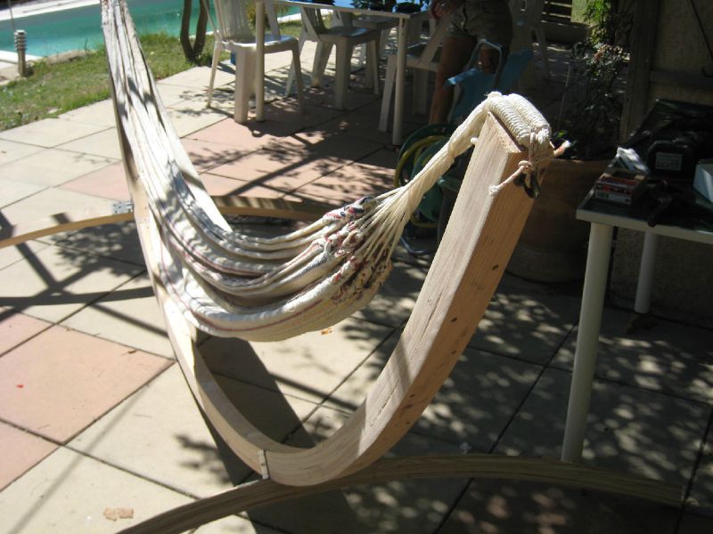 J’avais envie d’essayer la technique du bois cintré lamellé collé, je me suis lancé dans la réalisation d’un support de hamac.