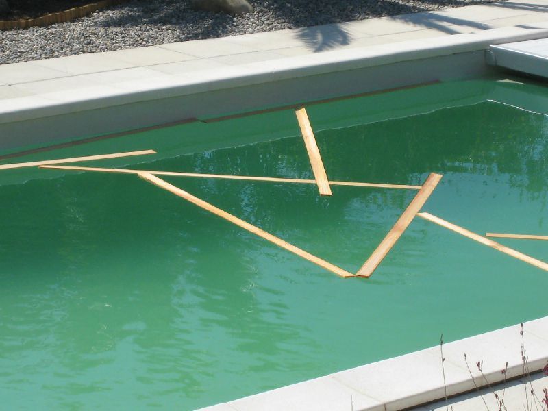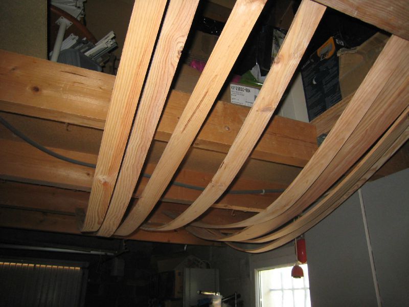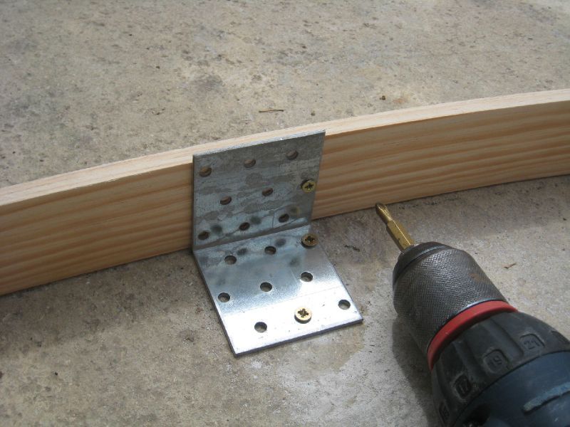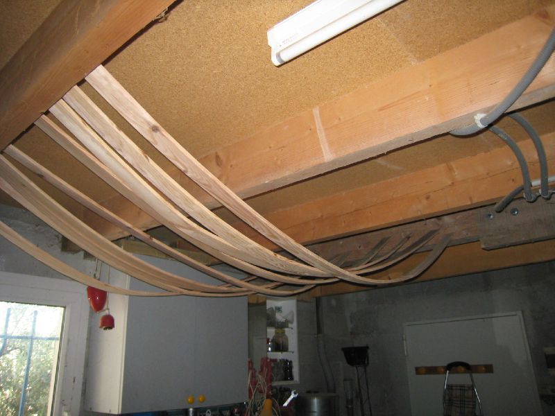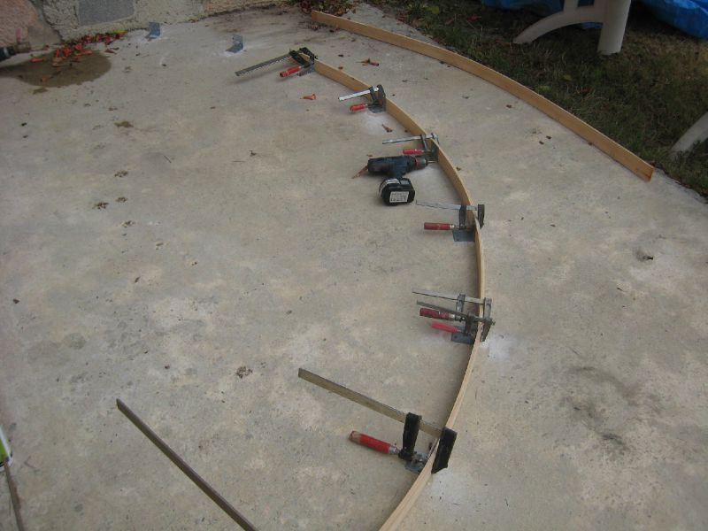 J’ai trempé les lames dans la piscine et une fois humides je les ai coincées entre deux poutres du garage, et les ai laissées sécher ainsi pour les pré-cintrer.