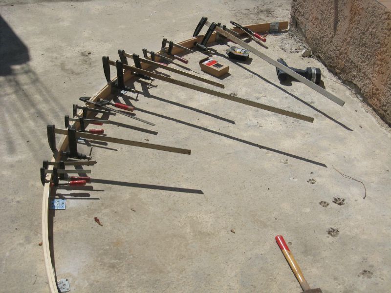 ba écoutez j’adore moi j’ai fait pareille ya mtn 4ans. je l’ai fait avec du sapin simplement et j’ais fait cela avec un panneau mdf pour le gabarit cintré apres avoir tracé mon cintre j’ai calé tous simplement des cales autour de celui ci serré collé avec des sert joint comme toi ; attention a ne ps oublier de ne ps coller la dernière lame qui vous servira tous simplement de cale anti trace de sert joint.