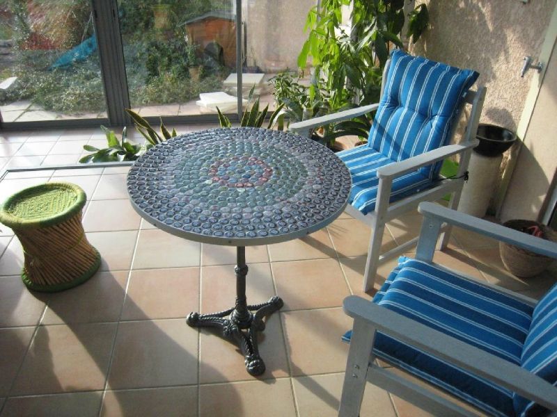 Nous avions une table de bar en marbre, mais le plateau s’est cassé, j’ai gardé le pied et je viens de lui redonner une deuxieme vie en lui ajoutant un plateau garni de capsules de bieres: