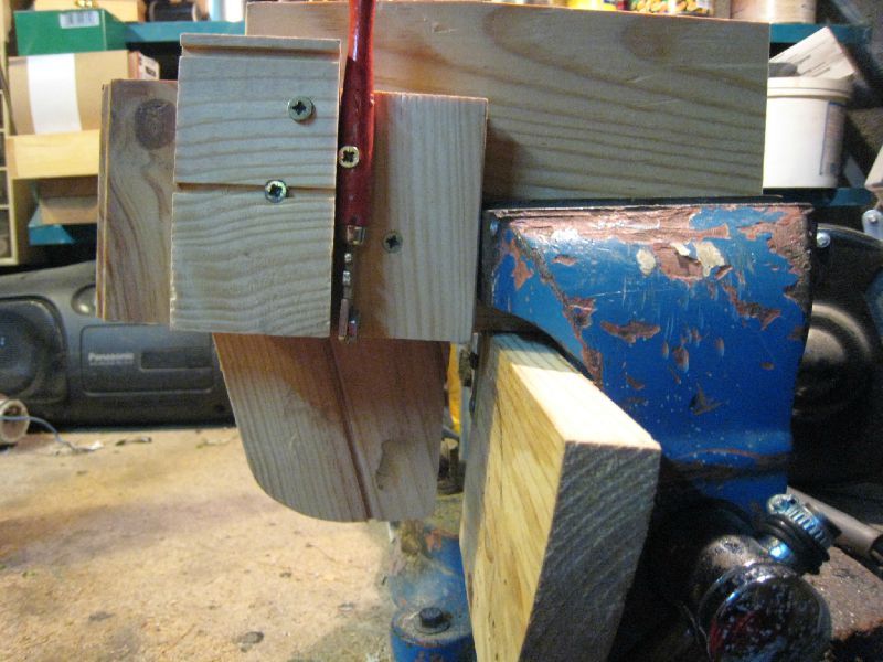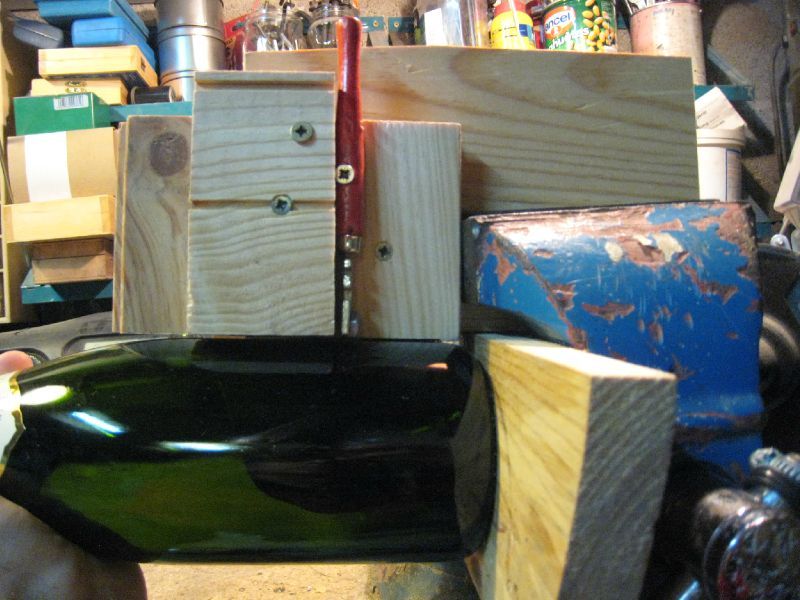 Il faut ensuite faire un trait de découpe à la molette de vitrier. Pour faire un trait bien circulaire au même niveau j’ai fait un montage sur mon étau, qui guide la bouteille et maintien la molette, je plaque ensuite la bouteille contre la molette et je tourne.