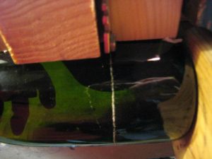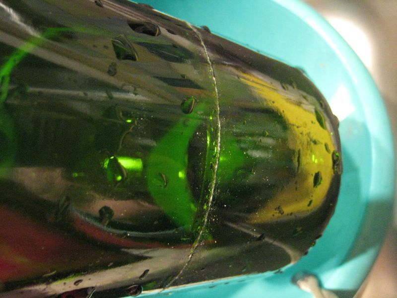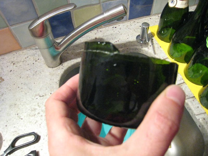On doit voir la fissure tout autour de la bouteille, à l’intérieur. Pour séparer les deux bouts on peut souffler dans la bouteille, la pression écarte le fond, ou bien faire fléchir le fond en tournant.