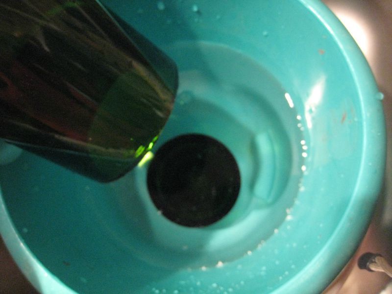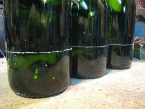 La prochaine étape se déroule de nouveau à la cuisine. Il faut un seau d’eau froide, de la laine, des ciseaux, de l’alcool à bruler. Il s’agit de chauffer le trait de découpe et de refroidir brutalement la bouteille qui se fend.