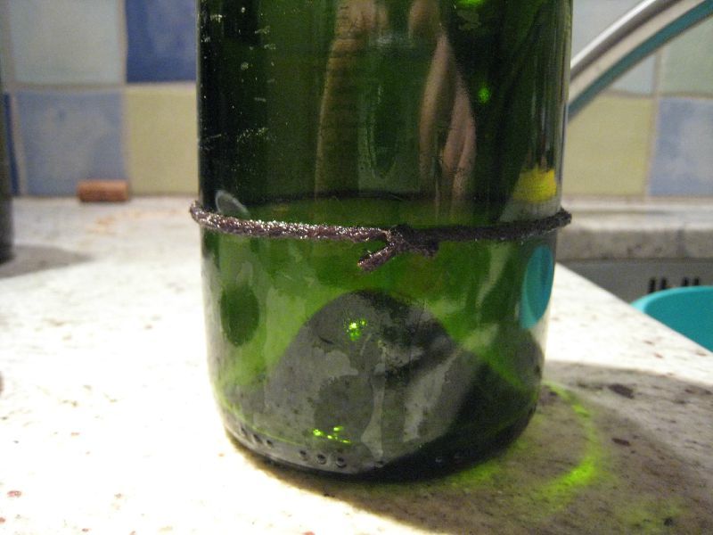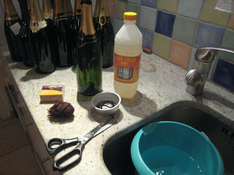 On découpe un brin de laine de longueur suffisante pour pouvoir le nouer autour de la bouteille. La laine doit être assez grosse pour bruler assez longtemps, mais pas trop. On trempe le brin dans l’alcool à bruler. On le noue autour de la bouteille. Couper les brins qui dépassent du noeud bien à ras, sinon la flamme est trop large et on chauffe une zone trop large. Essuyer l’alcool qui a éventuellement coulé sur la bouteille, de maniere à concentrer la flamme sur la découpe.