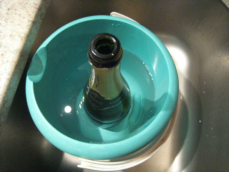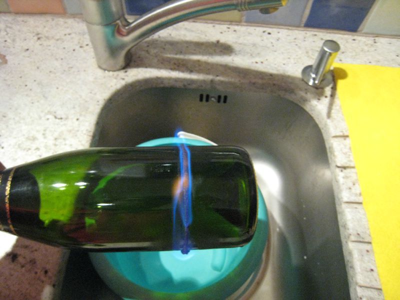 Enflammer (prenez des précautions avec la coupelle d’alcool), et laisser bruler en tournant la bouteille. Quand le brin est consumé, l’enlever, et tremper la bouteille dans l’eau froide. Si tout va bien on entend la bouteille qui se fend.