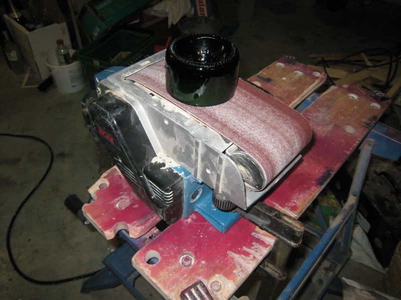 La prochaine étape est la finition des chants. Je le fais avec une ponceuse à bande fixée sur un établi de manière à avoir la bande vers moi. On pose simplement le fond de bouteille sur la bande en appuyant et en tournant.