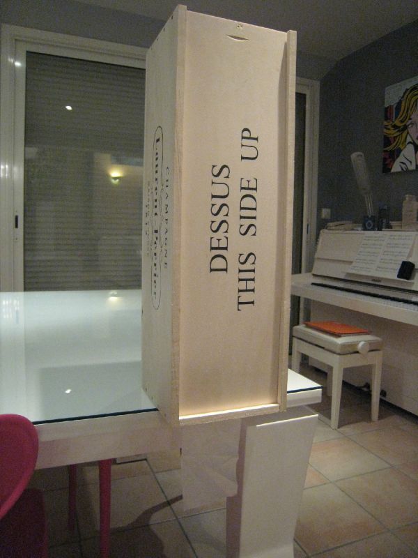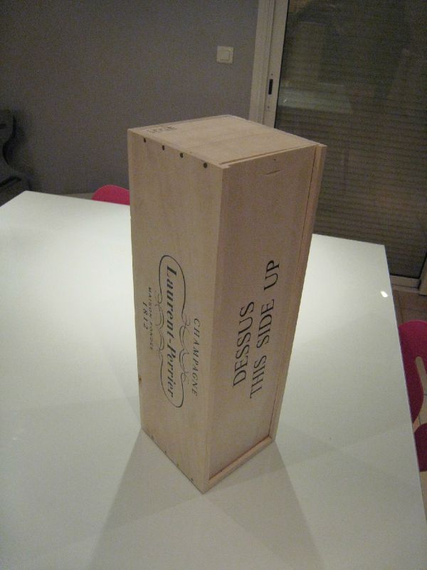 Pour fêter son futur fils, Sylvain a acheté un jéroboam de champagne dans une belle boite. Il m’a donné la bouteille vide (un futur cendrier?) et la boite. Elle est assez belle et je cherchais un projet. J’entends d’ici les commentaires sur: quelle famille d’alcooliques!
