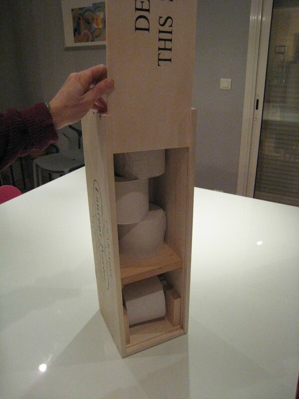 J’en ai fait un distributeur de papier toilette, avec rangement pour la reserve, et du coup la boite va retourner chez Sylvain, dans ses toilettes.