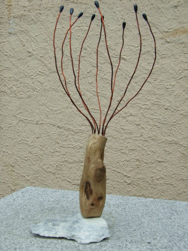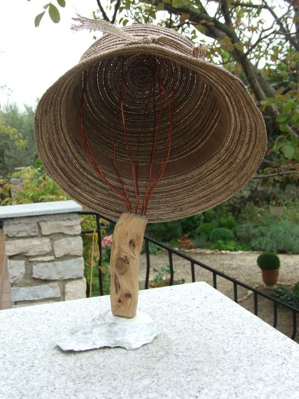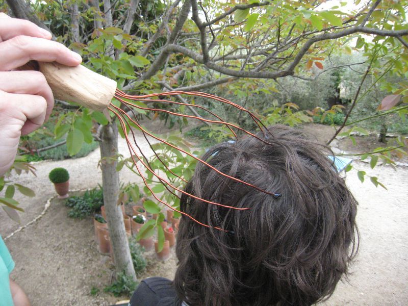 Le manche est en bois d’olivier, le socle en pierre, les fils en cuivre, terminés par une perle pour que le contact ne blesse pas la tête.