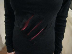 Pour les réaliser, j’ai récupéré de vieux T-shirts colorés, j’en ai coupé un morceau, que j’ai cousu à l’intérieur du T-shirt noir, j’ai fait des coutures pour délimiter des zones, et j’ai découpé le T-shirt noir pour laisser voir l’intérieur.