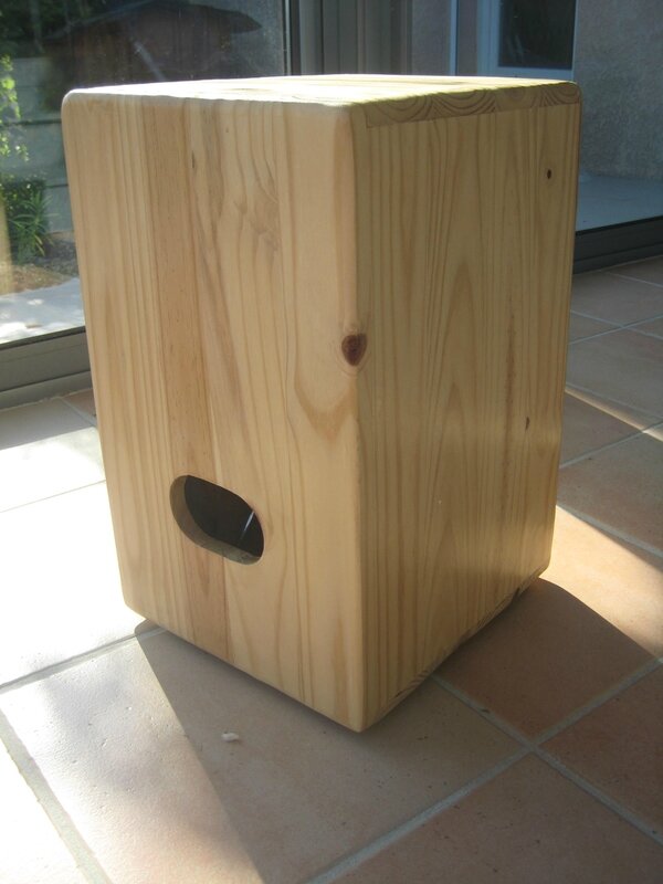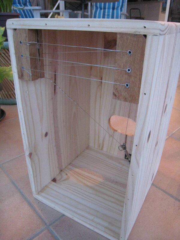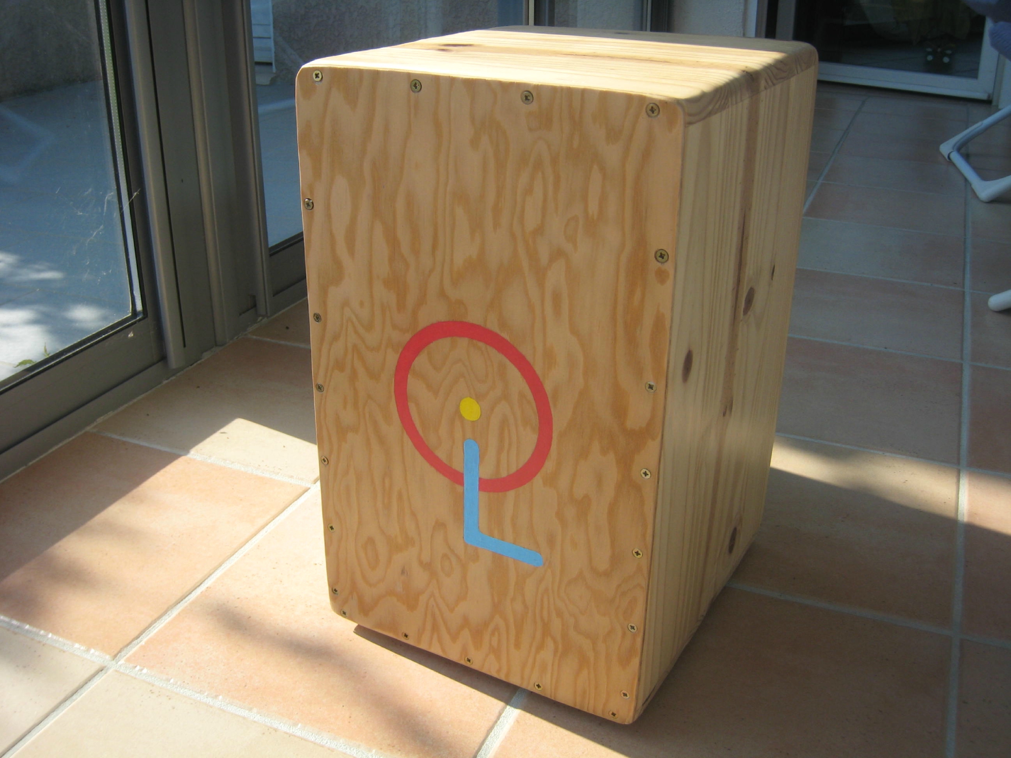 Le couvercle (ou la « tapa » sur laquelle on tape, mais en espagnol c’est bien le sens de couvercle) est en contreplaqué de 3 mm vissé. Il faut laisser le haut légèrement libre (en ne serrant pas totalement les vis) pour obtenir le son claqué, alors que le bas est bien vissé pour obtenir le son plus sourd.