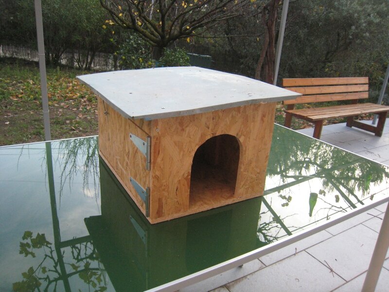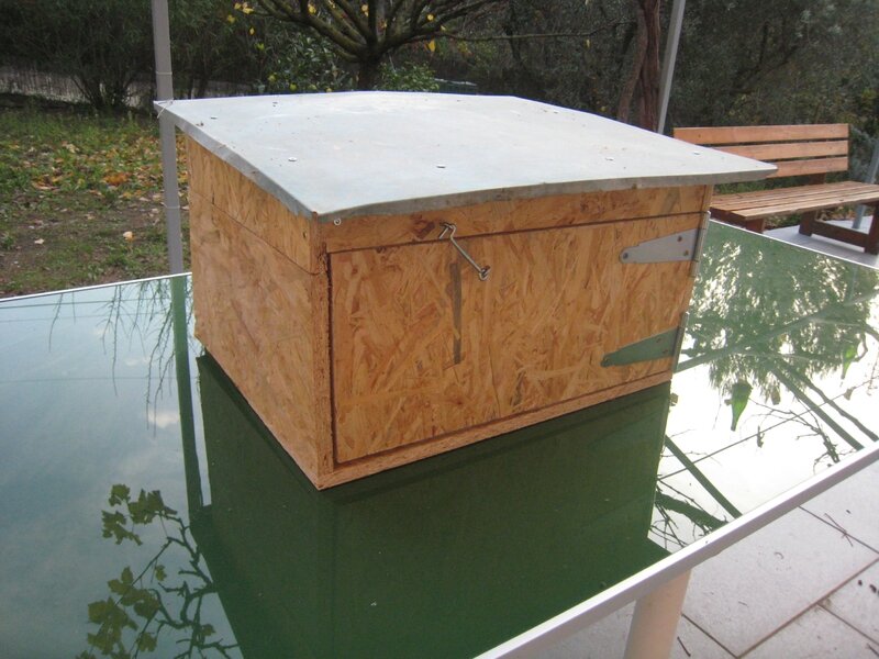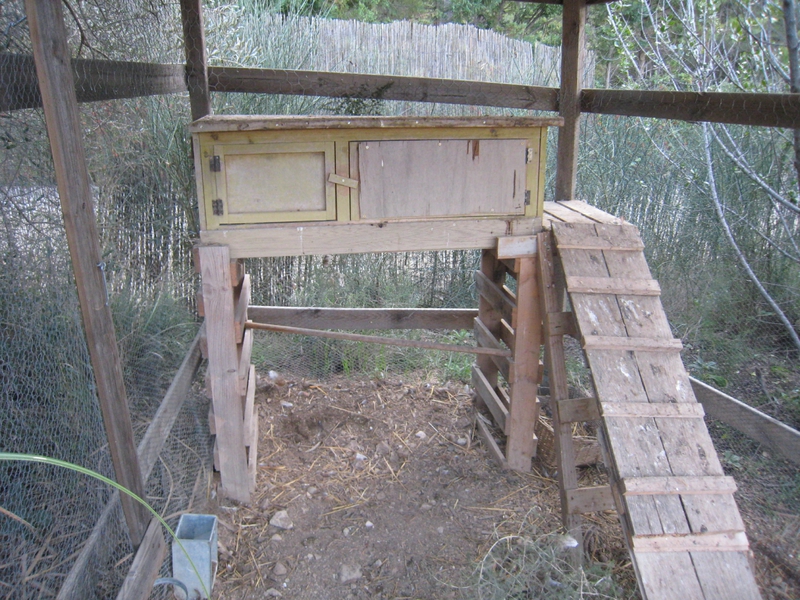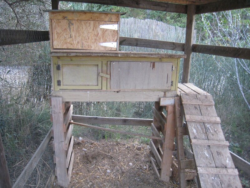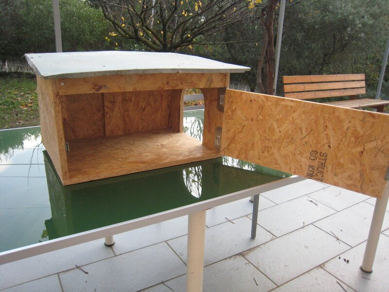 Nous avons un poulailler, avec 3 poules, et claude a voulu une quatrième. Yves nous a donné 2 oeufs fécondés, et nous avons laissé faire la nature. Sur les 2 oeufs, un poussin est né et en grandissant, nous nous sommes aperçus que ce n’était pas une poule mais un coq! Et maintenant nous avons donc 3 poules et un coq. Mais la société des volailles a ses codes…et le coq ne dort pas avec les poules (du moins chez nous), il dort sur le toit du poulailler. comme le froid arrive, j’ai fabriqué un étage au poulailler, pour le coq avec des chutes de bois de l’atelier et une tole d’acier zingué d’une cage à lapin.