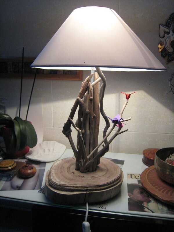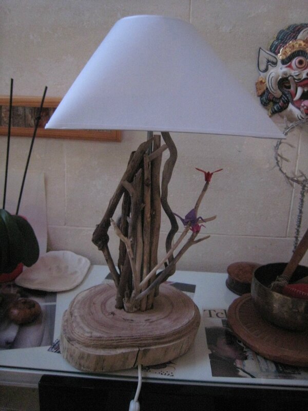 Pour Noël, j’avais demandé des cadeaux fabriqués à mes filles. Elles ont relevé le défi, et Chloé et Romain m’ont offert une lampe faite avec du bois flotté ramassé à la plage à Antibes.