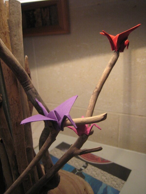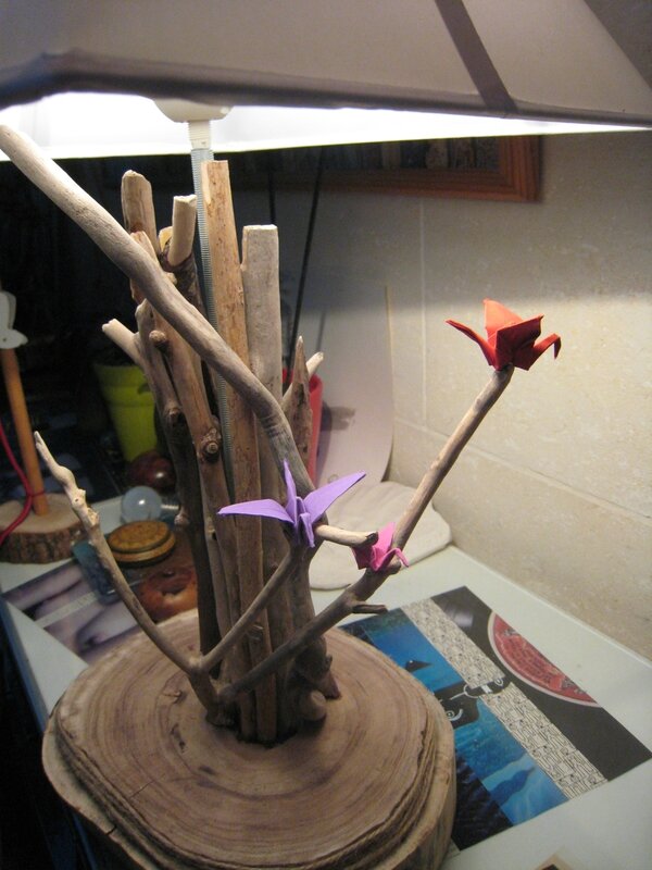 Romain a fait les oiseaux en origami. J’ai apporté un peu de support au projet avec la fourniture du socle qui vient d’un tronc récupéré chez Marie Claire et la tronçonneuse et la défonceuse.