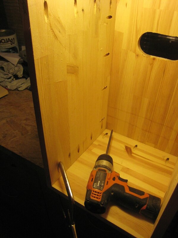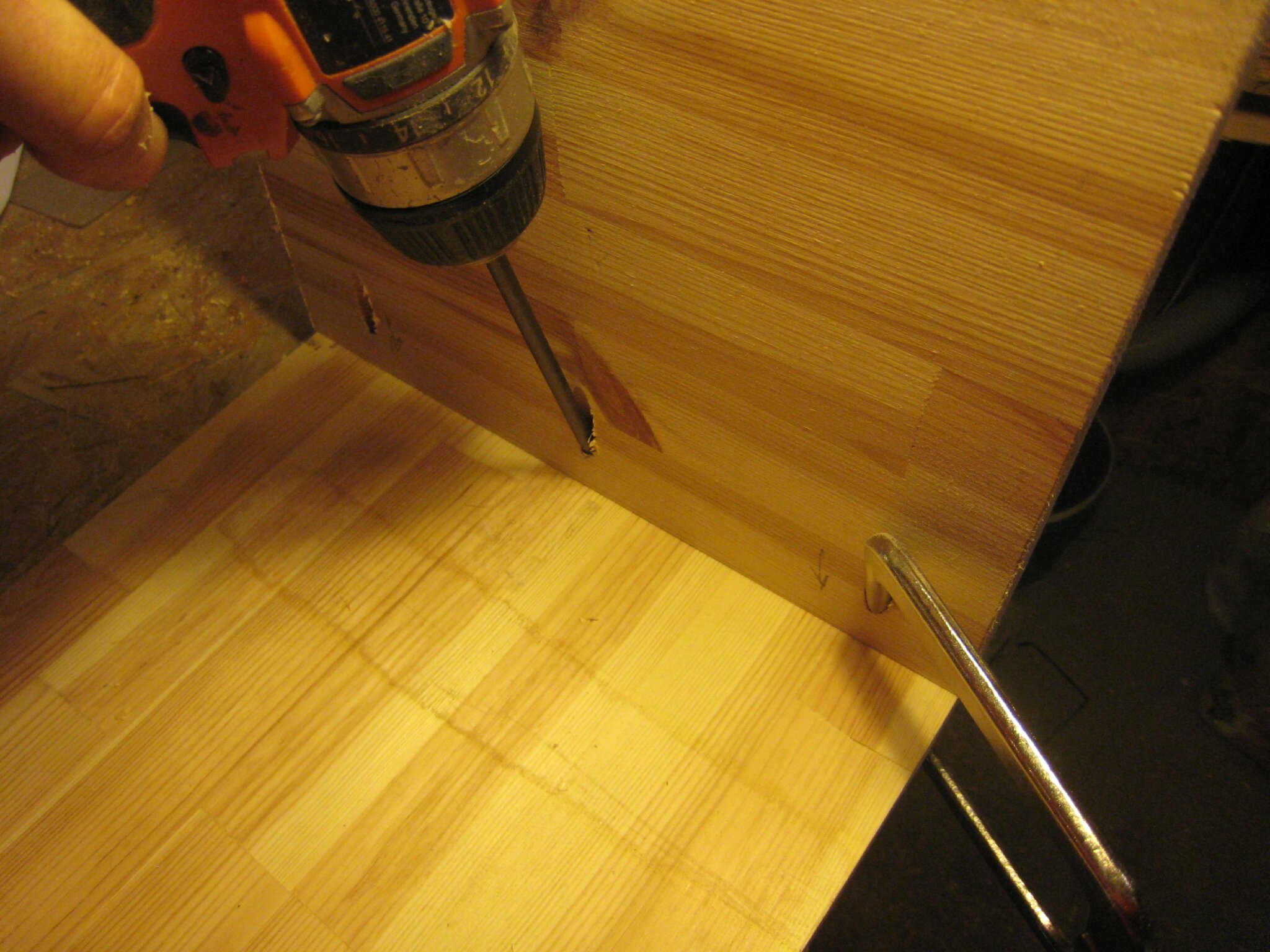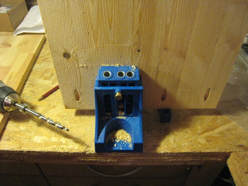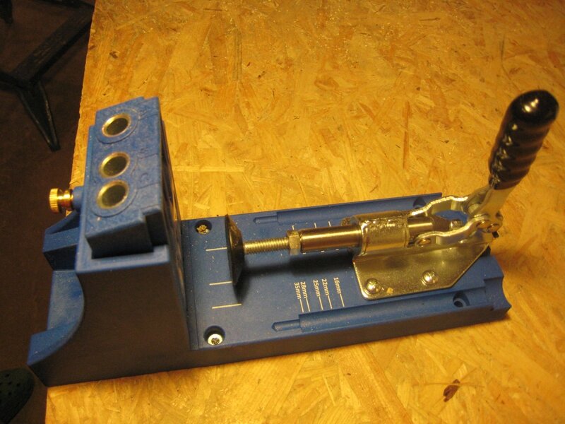 J’ai repris les dimensions du cajon précédent: 500*300*320, les planches sont en pin contrecollé de 18 mm d’épaisseur (un lot de planches de 300 mm de large). J’ai coupé les planches à la scie à onglets (c’est la limite de capacité en largeur) et j’ai ensuite utilisé le canon Kreg. Le principe consiste à faire un lamage et un trou en biais dans la planche à assembler, qui recevra une vis à large tête, la vis arrivant au milieu de la tranche. Il faut régler la position du canon et de la butée sur le foret en fonction de l ‘épaisseur des planches à assembler. Pour tenir les pièces entre elles, il y a une pince très pratique que rentre dans le perçcage et positionne bien les pièces. Cela va assez vite de construire la boite, et c’est très facile. C’est adapté aux situations où on a une face cachée, car les lamages ne sont pas très beaux.