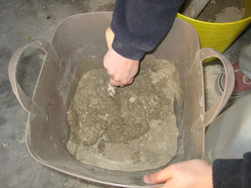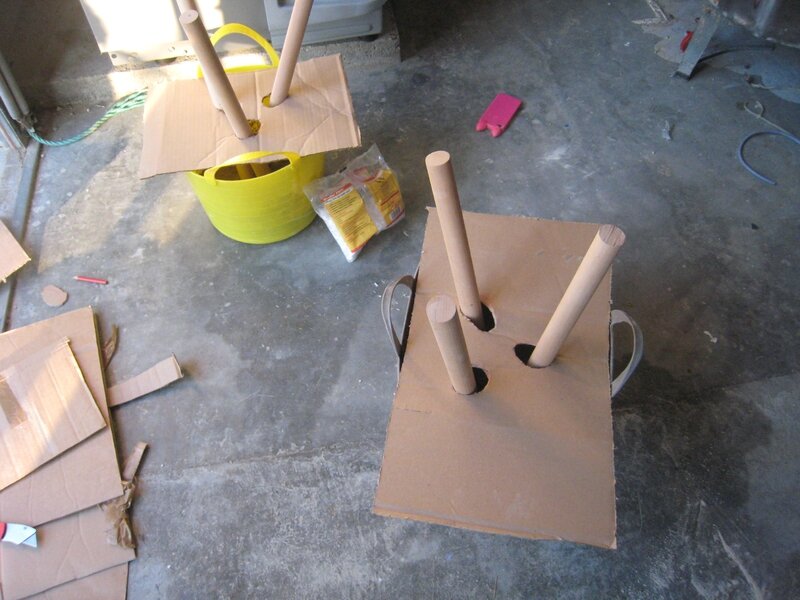 Après 2 tentatives ratées (trop d’eau, le béton (et le seau) qui se fend, les pieds qui se déchaussent, les pieds trop inclinés) la troisième a été concluante.