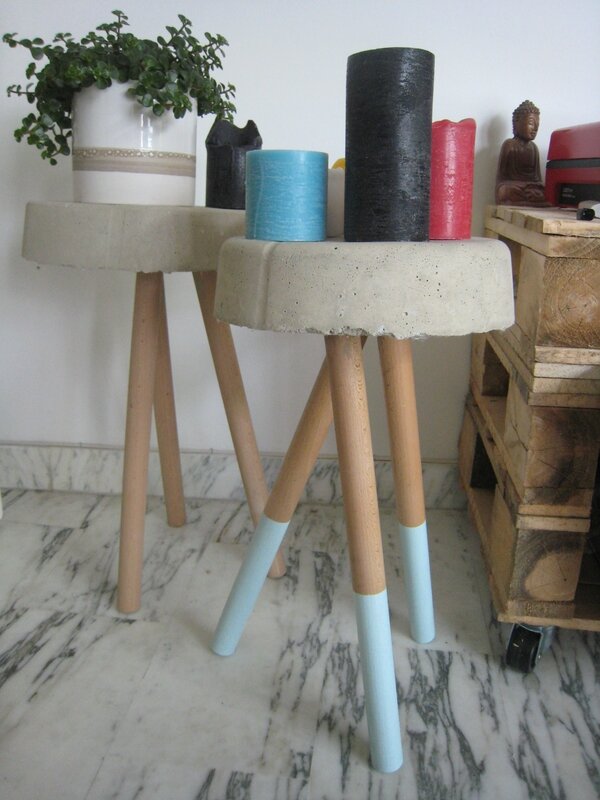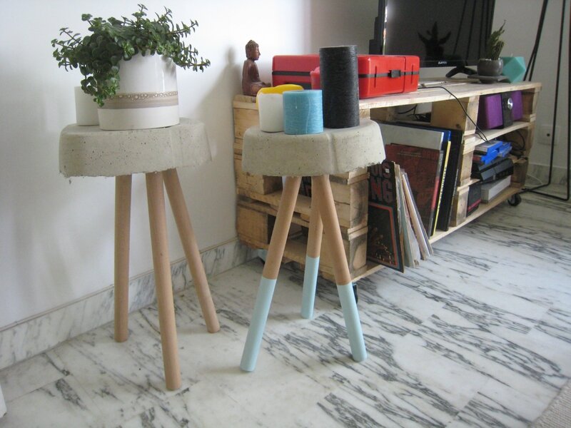 Chloé et Romain meublent leur maison. Ils se sont lancés dans la fabrication de tabourets en béton avec des pieds en bois noyés dans le béton.