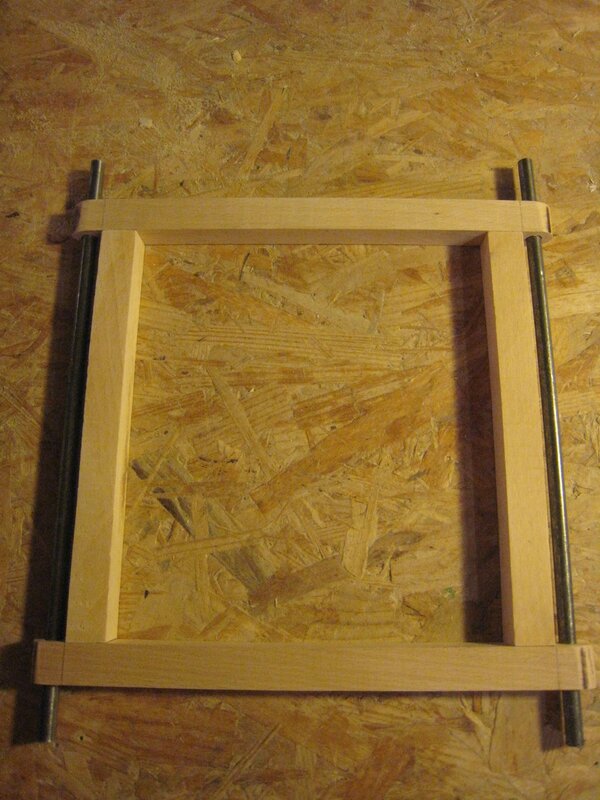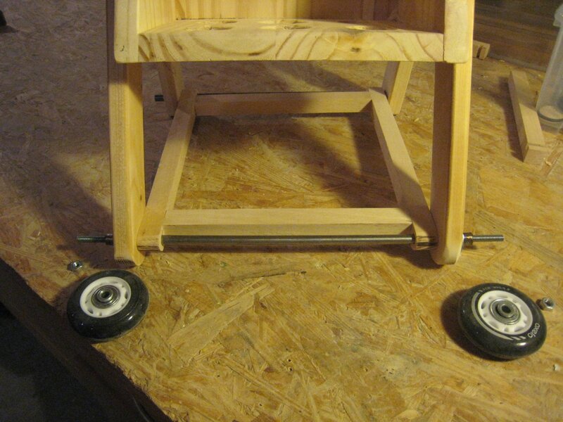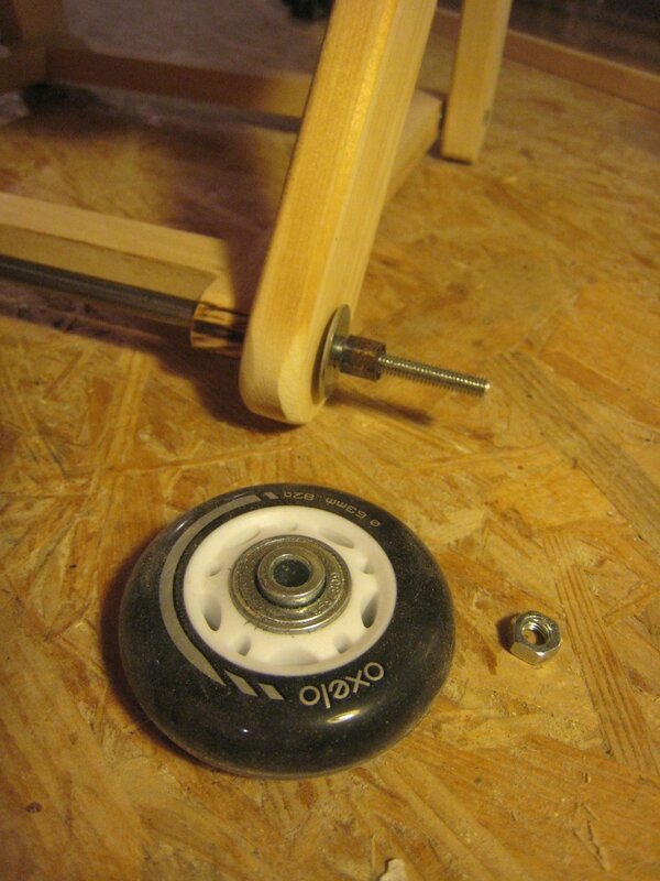 J’ai fait un cadre pour bloquer les roues. Les roues sont des roues de roller, et le montage est similaire à la draisienne: une tige filetée serre les roues entres elles, un tube fait entretoise, et un tube plus gros permet de serrer la roue sur le pied.
