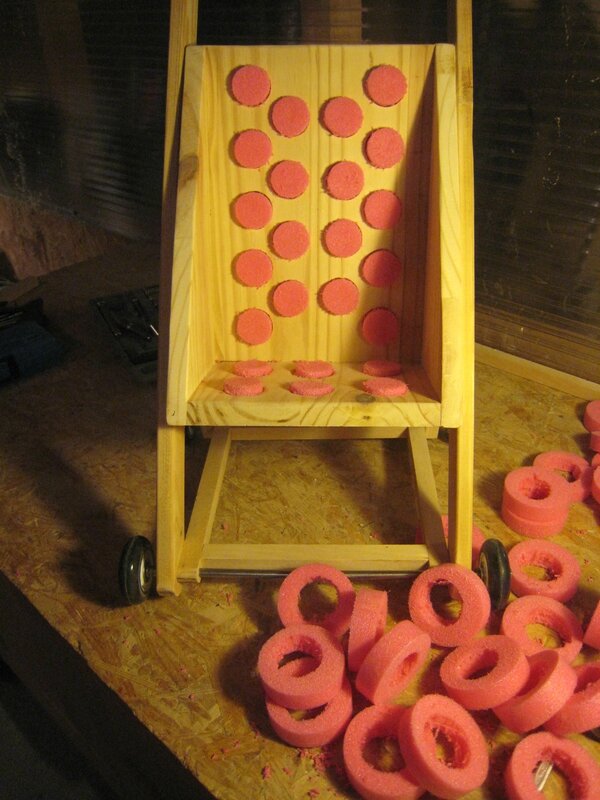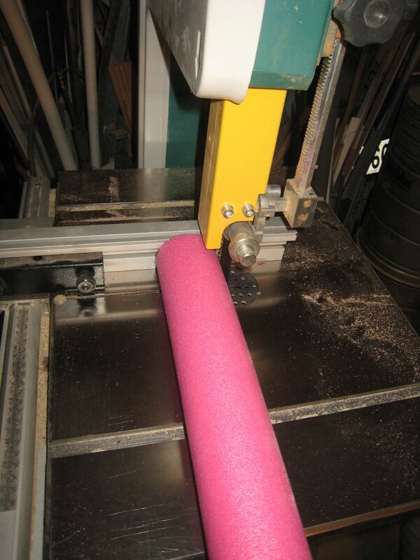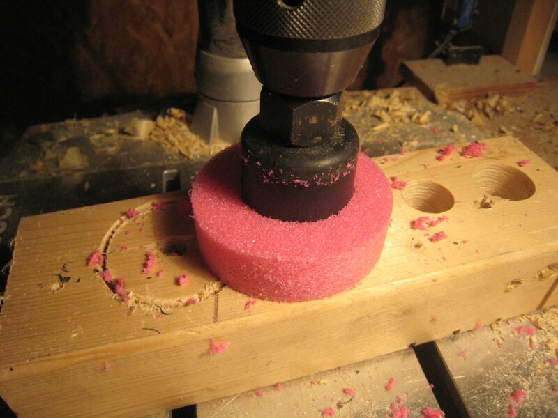 Pour remplir les trous, j’ai fait des plots en mousse à partir d’une frite en mousse de piscine. J’ai coupé des rondelles à la scie à ruban, et j’ai fait des ronds avec une scie cloche que j’ai collés dans les trous.