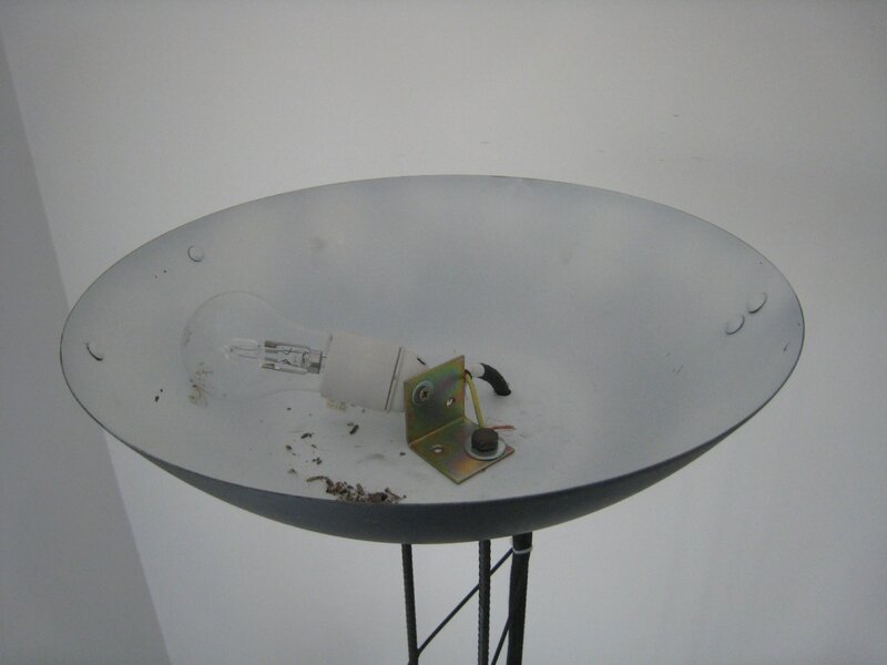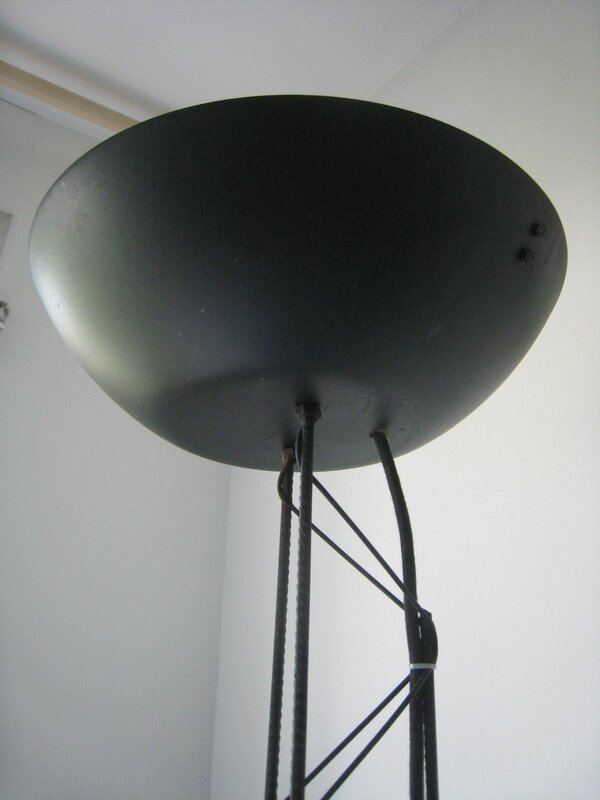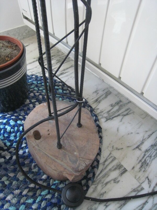 Dans l’appartement de Chloé et Romain, il n’y a pas d’ampoules au plafond, mais des prises commandées. J’ai fait en vitesse un lampadaire avec un wok. J’ai récupéré la structure que j’avais faite il y a longtemps avec une rondelle de ciprès et du fer à béton (un treillis à 3 fers utilisé pour les planchers et les poutres). Pour le réflecteur, j’ai utilisé un wok qui avait été mis de coté car il accrochait. J’ai simplement démonté la poignée, fait quelques trous, et peint à la bombe l’extérieur en noir et l’intérieur en blanc.