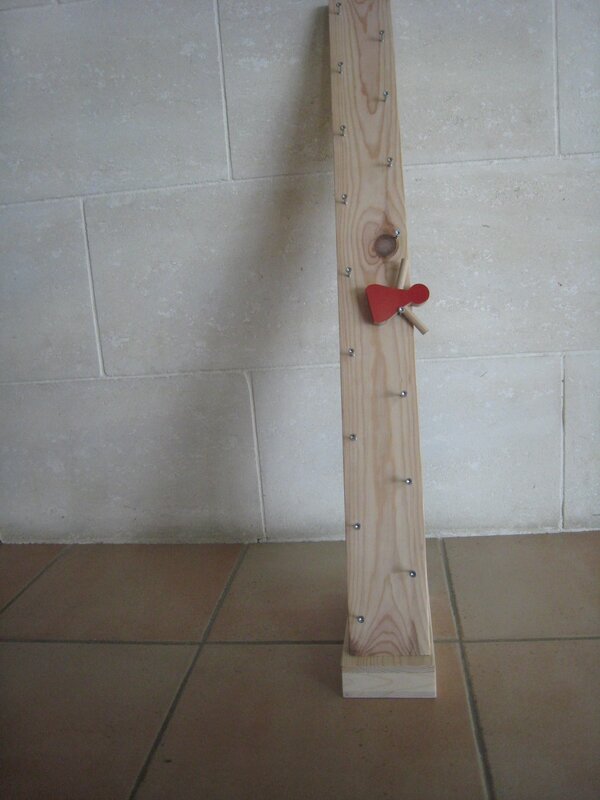 Pour les montants auxquels s’accroche le bonhomme, j’ai choisi d’utiliser des vis, c’est facile à fixer et la tête de la vis retient le bonhomme. J’ai fait des essais sur une vielle planche pour trouver l’écartement des vis et l’inclinaison de la planche.