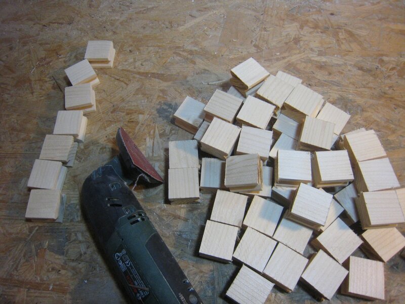 J’ai réalisé la rainure en V à la défonceuse, puis j’ai coupé les pièces à la scie à onglets et poncé chaque pièce (il y en a 49)