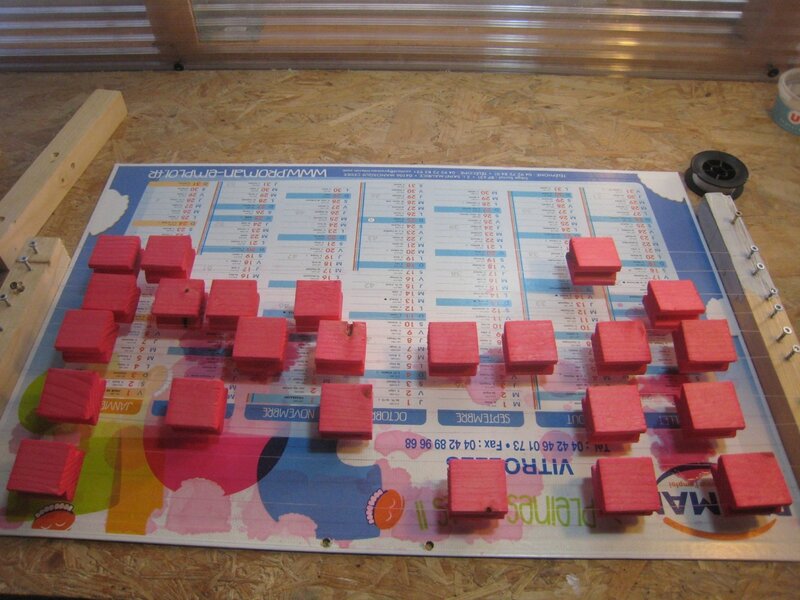 Pour colorer les pièces, j’ai encore utilisé la technique du colorant alimentaire mélangé à de l’alcool. Pour faire sécher les pièces sans laisser de traces, je l’es ai enfilées entre 2 fils de nylon. Comme 49 est impair, j’en ai laissé un couleur bois.