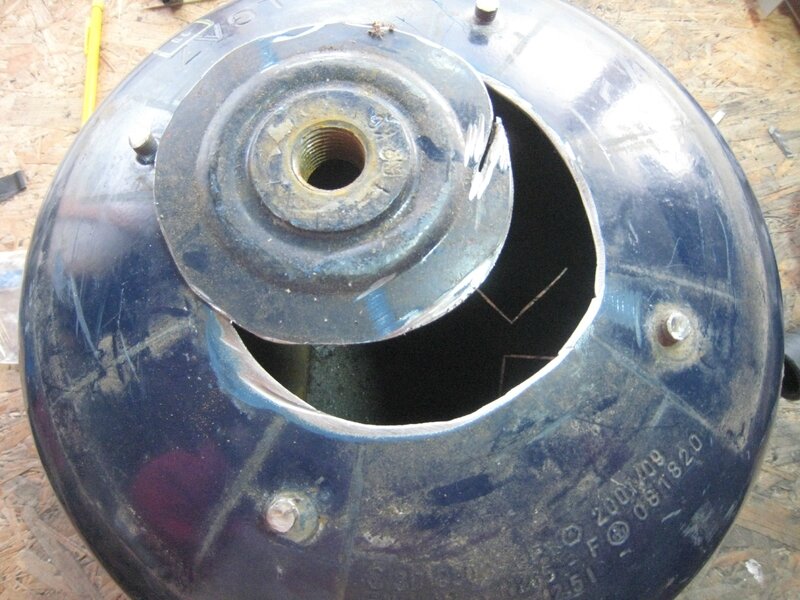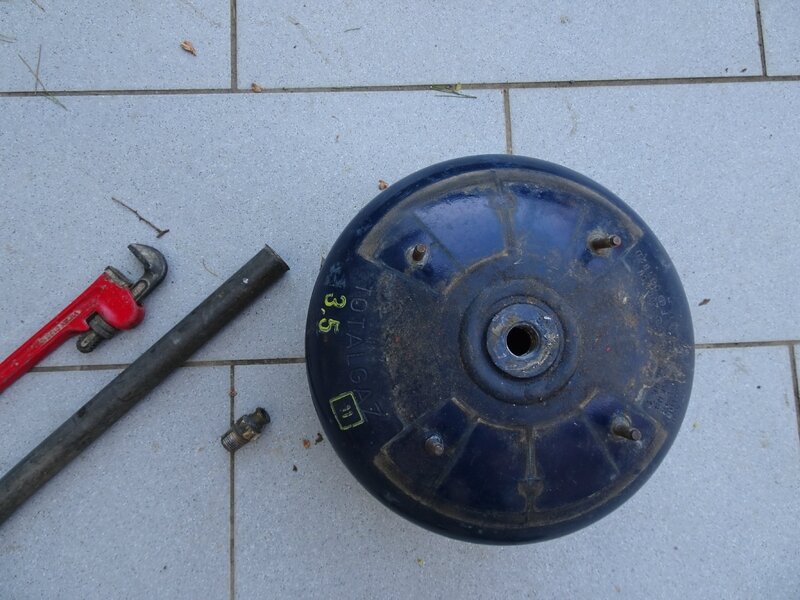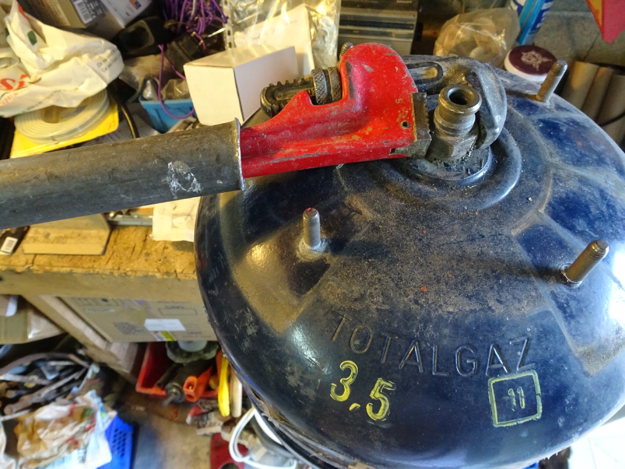 La première opération, consiste à démonter la valve. il faut tout d’abord s’assurer que la bouteille est bien vide. J’ai fixé la bouteille dans l’étau par sa base, et j’ai utilisé une clé à griffe avec une rallonge en tube. Même ainsi, c’est viril. La valve est conique et est montée avec une colle.