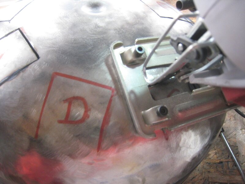 J’ai ensuite fait une ouverture circulaire dans le fond à la place de la fixation de la valve. J’ai recoupé les goujons de fixation de la poignée, mais j’ai gardé une petite longueur pour faire des pieds qui permettent de surélever le fond et de laisser un passage pour le son qui sort du dessous par le trou.