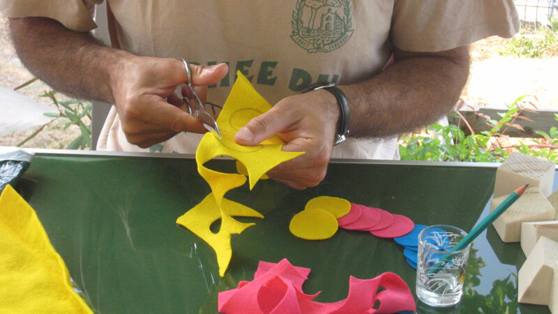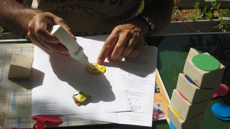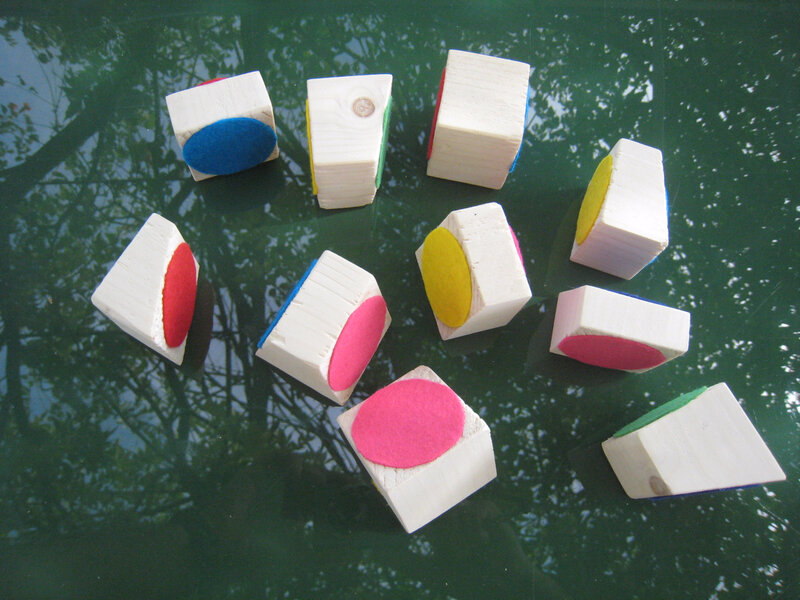 Après un peu de ponçage, j’ai collé des ronds de feutrine de différentes couleurs sur les faces.