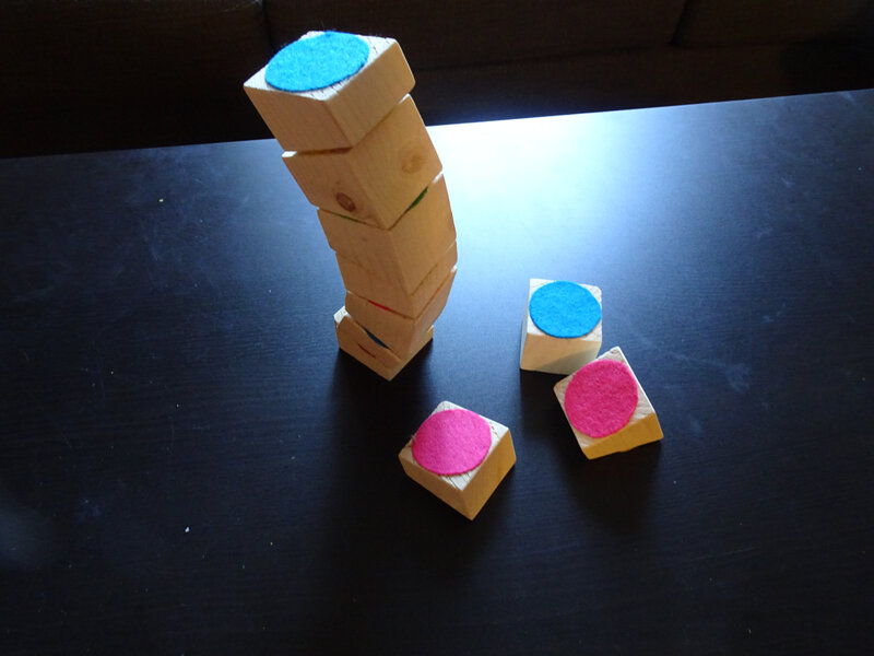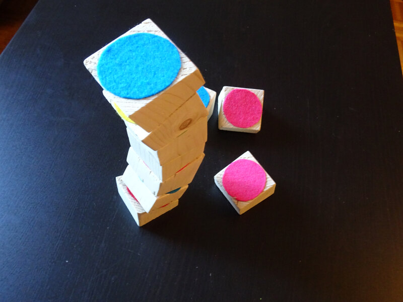 Un autre jouet pour Thaïs: des blocs de formes irrégulières à empiler. Il s’agit d’empiler les blocs en associant les couleurs qui sont sur les faces, et comme les faces sont irrégulières la pile est instable.