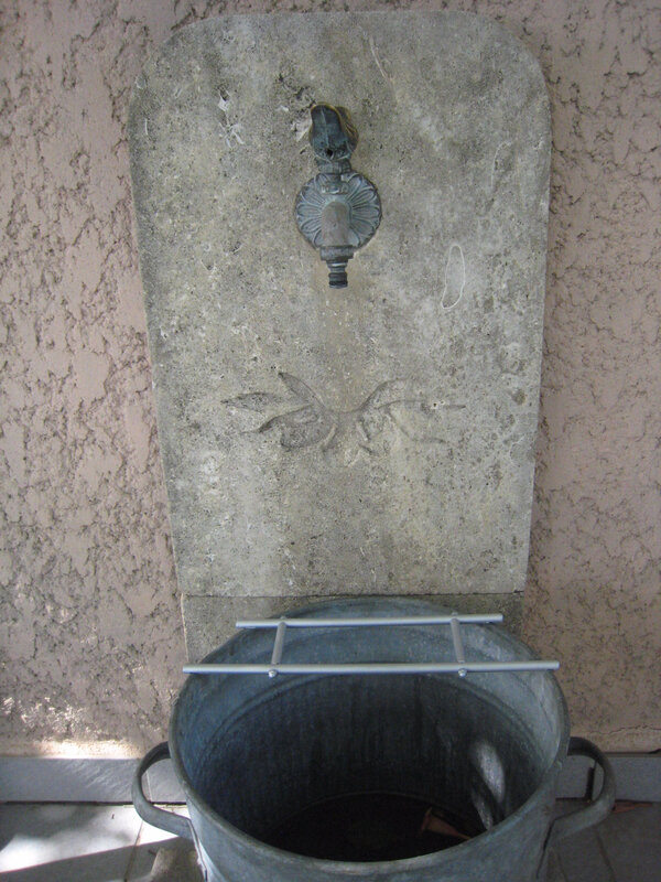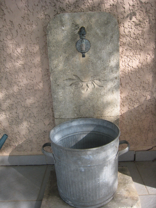 Nous avons un robinet sur la terrasse. J’avais fabriqué il y a longtemps une vasque en pierre qui s’est cassée quand on a refait la terrasse, mais il restait la pierre sur le mur avec la sculpture d’une branche d’olivier. Je cherchais depuis longtemps une idée pour refaire une vasque. Dans un salon des plantes, nous avons acheté un seau en zing qui va bien avec la pierre. Il est léger, et quand il se remplit il est facile de le vider sur les plantes du jardin. Il présente quand même un défaut, c’est que quand on veut remplir un arrosoir, il ne tient pas.J’ai donc fabriqué un support d’arrosoir.