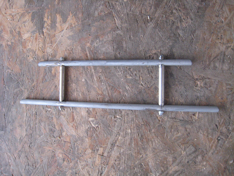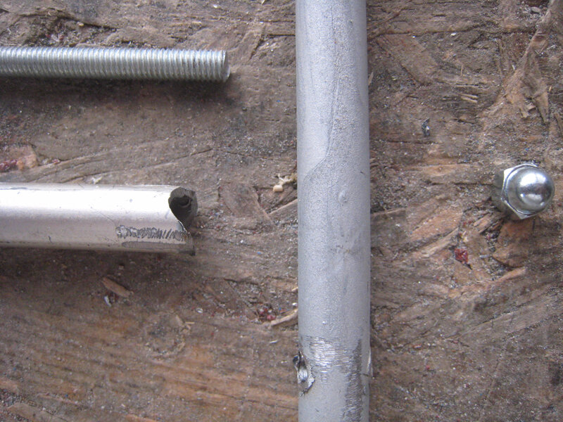 Pour le fabriquer j’ai utilé des tubes d’acier, coupés à la dimension du seau selon l’endroit prévu, dans lesquels j’ai fait une gorge pour caler le support sur le rebord du seau, et des tubes entretoises pour constituer une pièce qui se tient. J’ai assemblé les entretoises avec une tige filetée et des boulons.