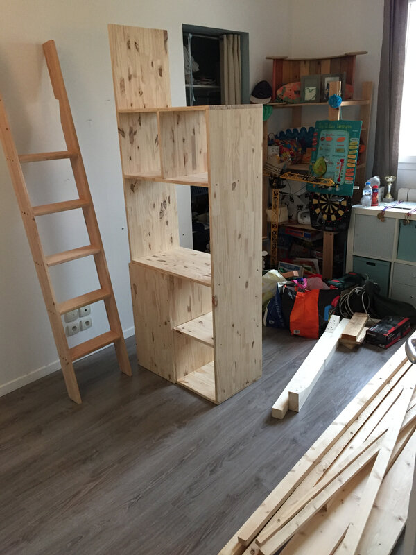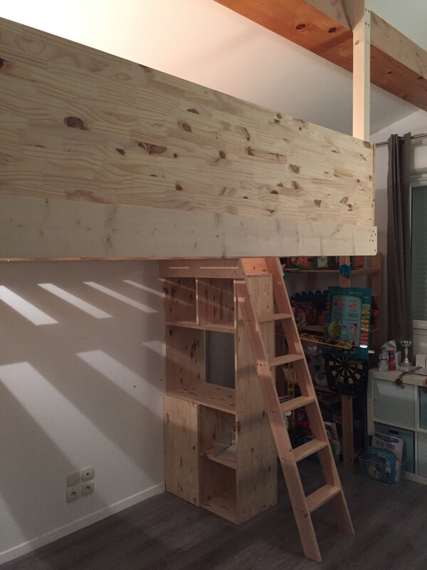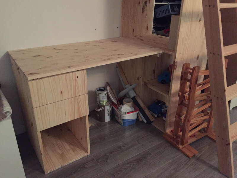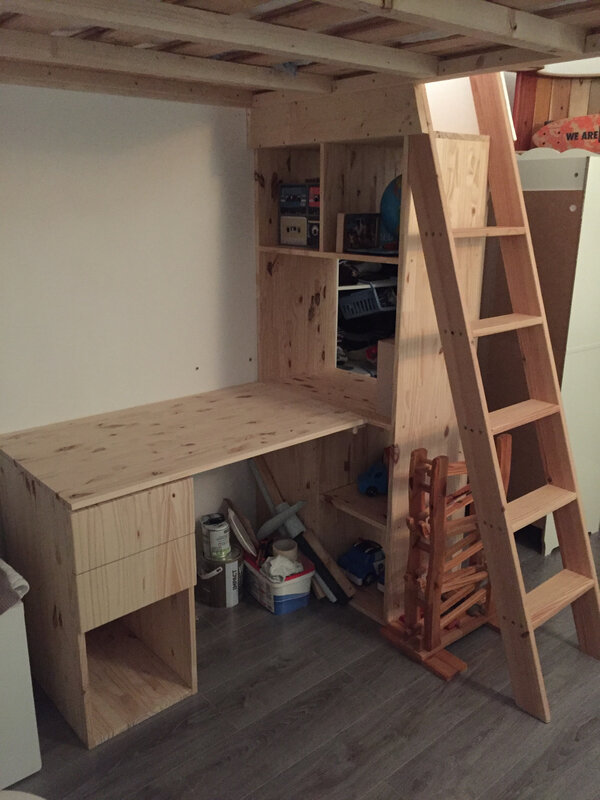 La mezzanine est habitable, mais pour finaliser le projet, j’ai aussi fabriqué le bureau qui repose sur le caisson de la mezzanine et sur un caisson avec 2 tiroirs.