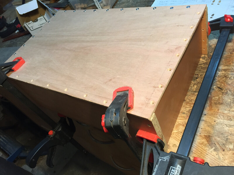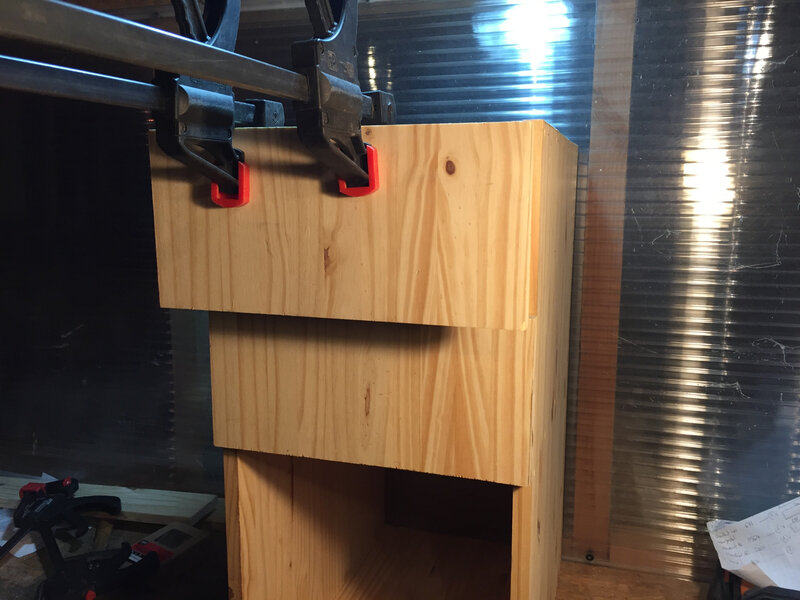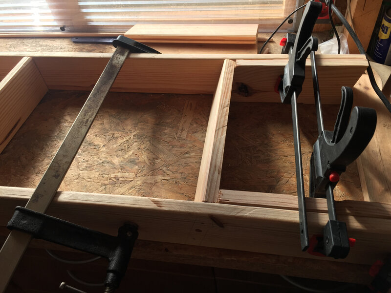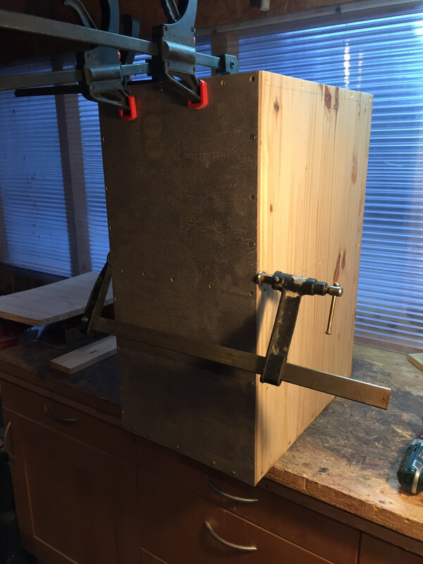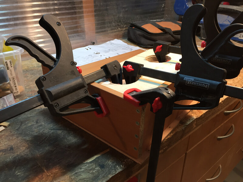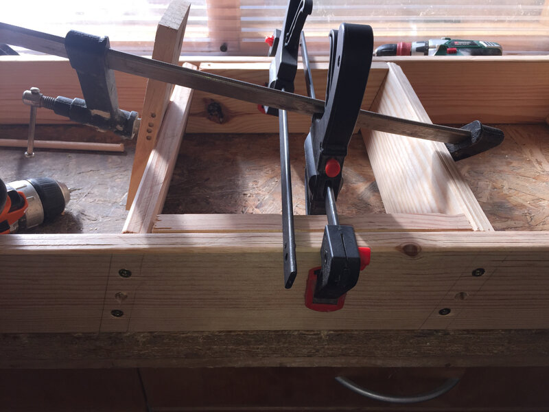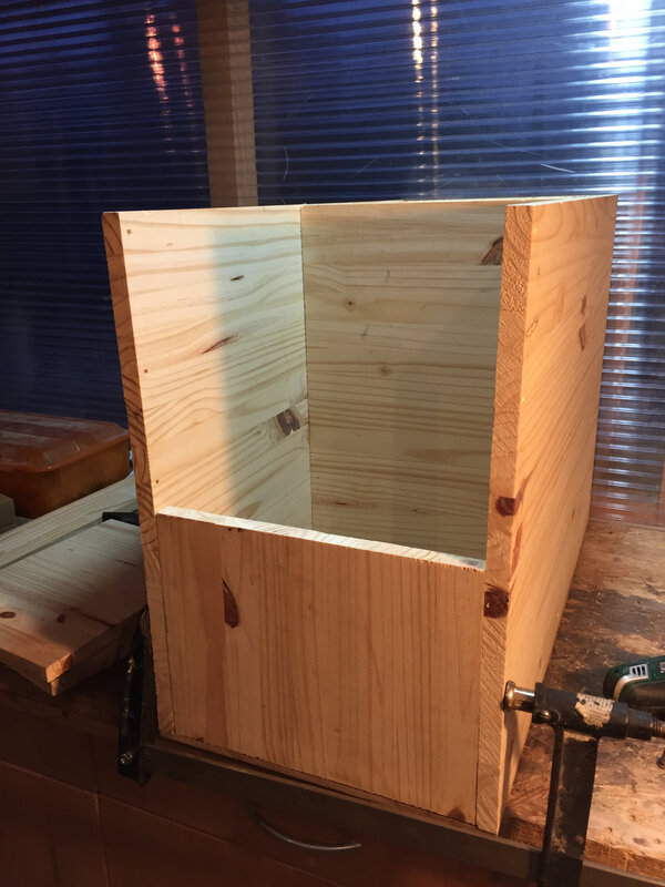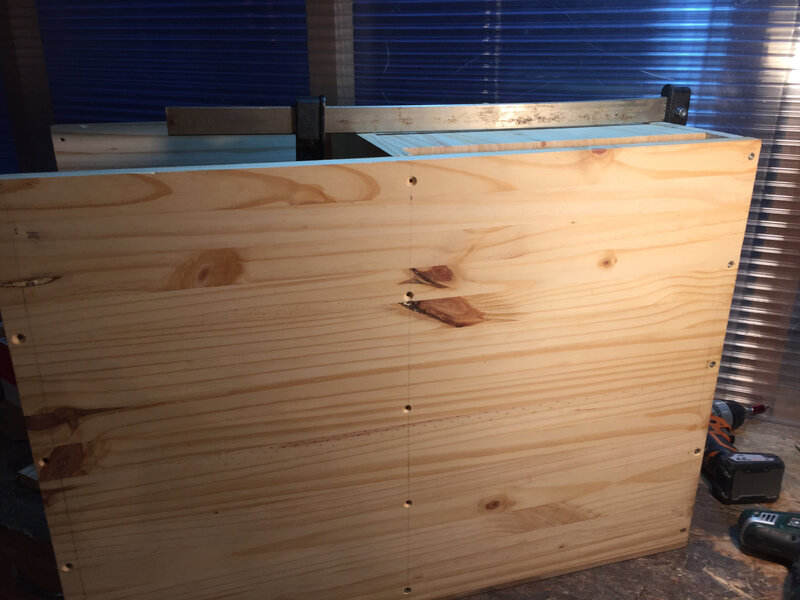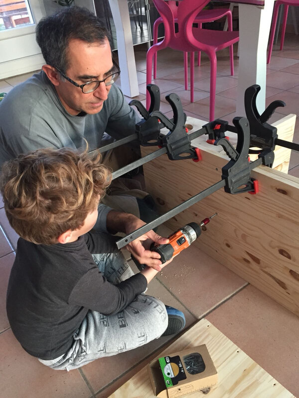 J’ai d’abord réalisé le caisson, comme je m’y prends toujours, en vissant au travers des panneaux dans la tranche des autres panneaux. Cela marche bien à condition de bien positionner et bloquer les planches et de faire des avant-trous. Pour l’assemblage j’ai eu l’aide de Léon, travail d’équipe!