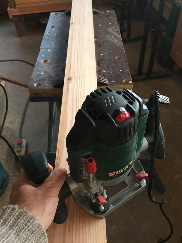 J’ai également fabriqué l’échelle de meunier. J’ai utilisé des lames de plancher, dont j’ai coupé la languette. J’ai cassé les chants avec la défonceuse.