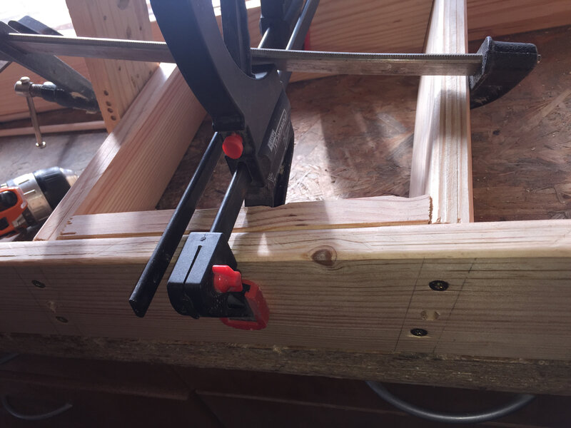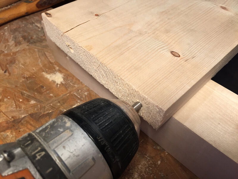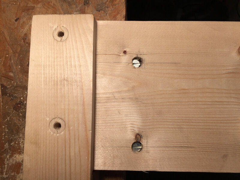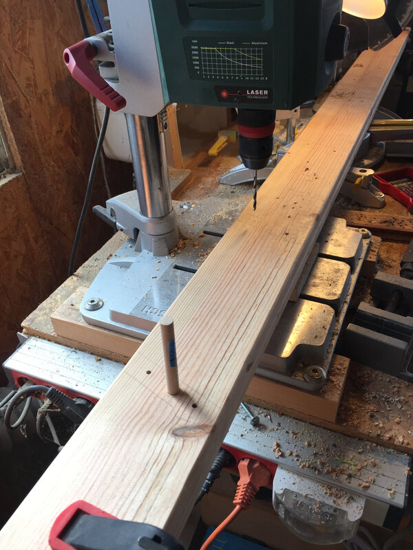 Puis j’ai percé les montants et assemblé les marches en utilisant des cales coupées avec un angle pour maintenir une inclinaison et un écartement des marches réguliers. J’ai mis un tourillon de chaque coté des marches, pour renforcer la tenue de la marche au cisaillement.