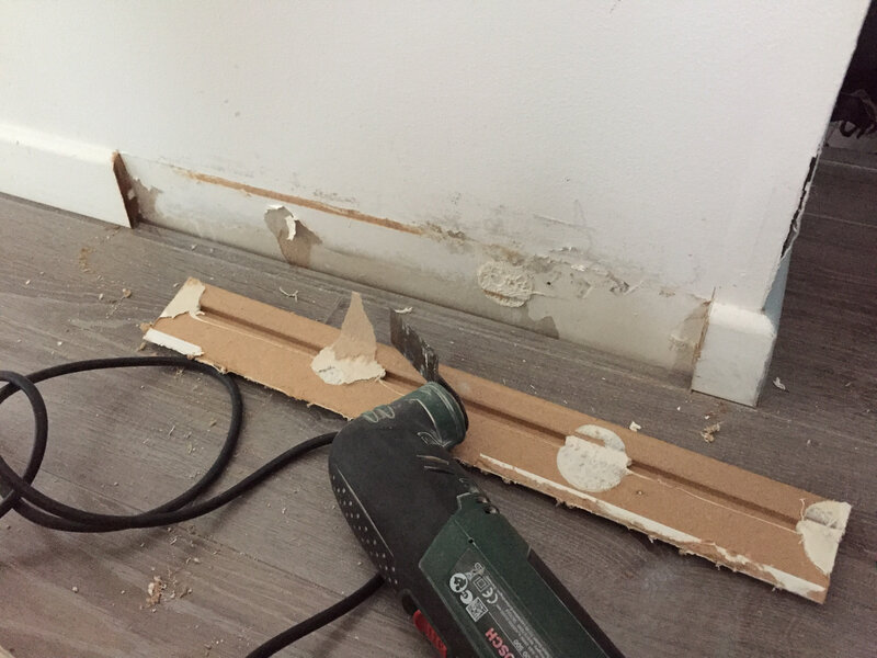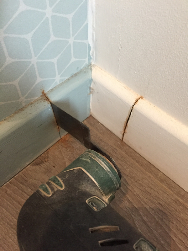 Pour pouvoir appliquer le caisson et le poteau contre le mur je découpe la plinthe à l’outil vibrant.