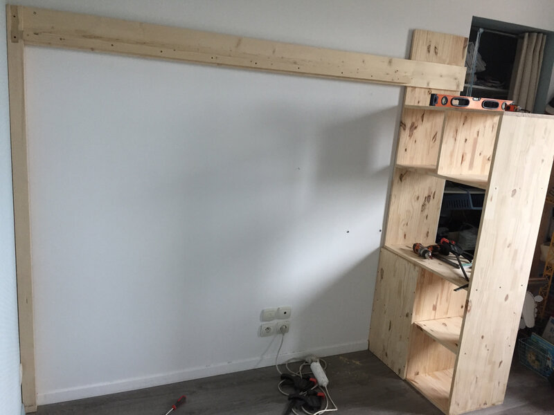Puis le premier montant transversal au poteau et à un tirant qui est fixé à la poutre de la charpente, et le deuxième au caisson, à l’échelle et également à un tirant qui est fixé à la charpente. Celà permet d’éviter le poteau au milieu de la pièce. Pour fixer le tirant à la poutre de la charpente inclinée, j’ai découpé des cales biaises qui permettent de récupérer l’angle. Pour mettre en place les éléments, j’ai eu besoin de Claude pour le premier, les suivants j’ai pu les mettre seul en place avec des serre-joints pour les maintenir.