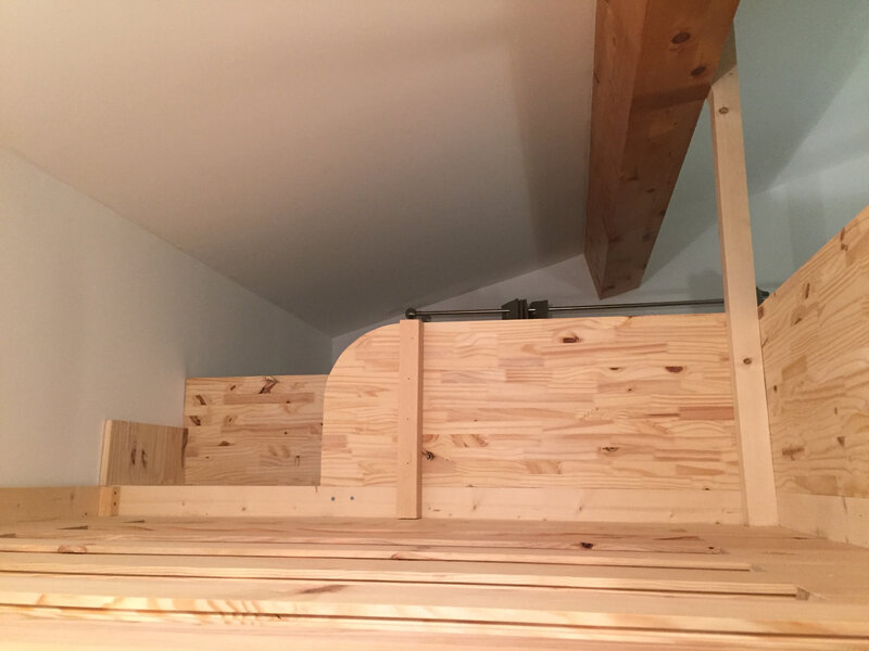 Puis j’ai mis en place le garde corps qui est tout simplement une planche de 40 cm de large et le plancher, en lames de pin emboitées, en laissant au milieu un espace d’une lame sur deux vide pour laisser respirer le matelas.