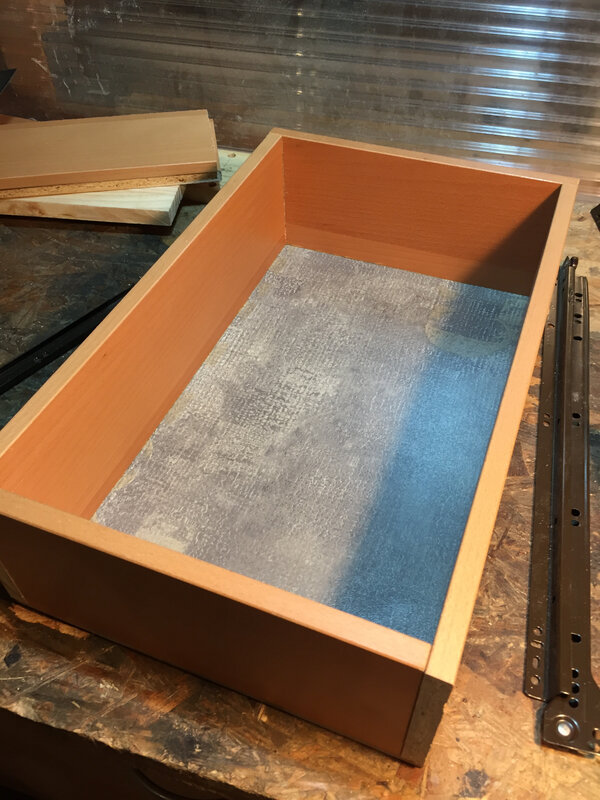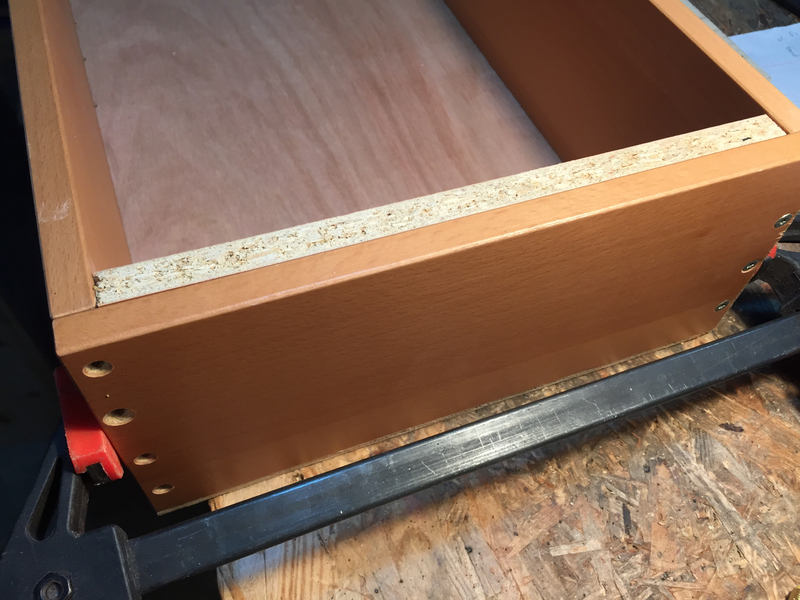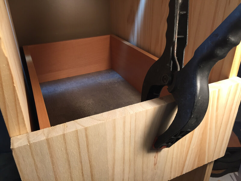 Puis j’ai fixé la façade sur le tiroir monté dans le meuble en s’alignant sur les cotés.