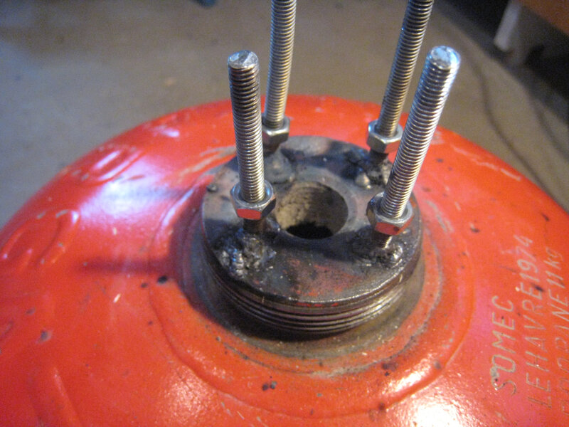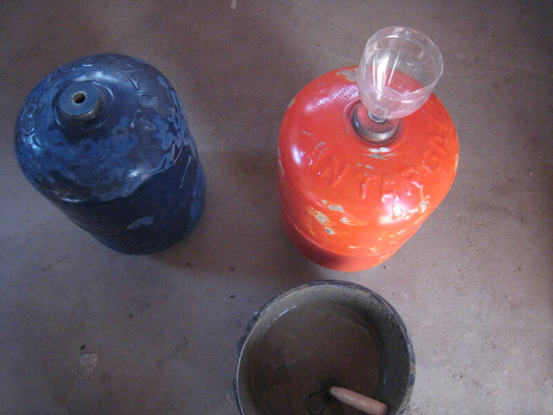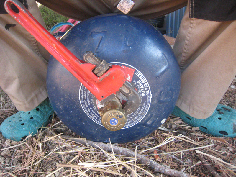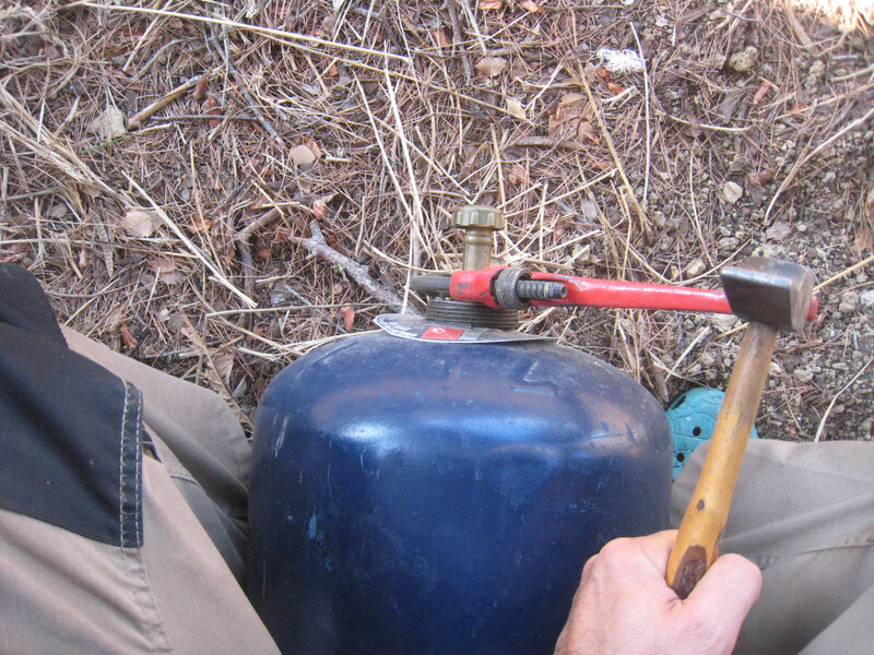 Pour le réaliser, j’ai recyclé une bouteille de gaz de 13 kg. Même si la bouteille est vide, il faut démonter la valve, et remplir la bouteille d’eau pour s’assurer qu’il n’y a plus de gaz. Pour démonter la valve, le plus simple est de coucher la bouteille, de s’asseoir dessus pour la bloquer, et démonter la valve avec une grosse clé et un marteau.