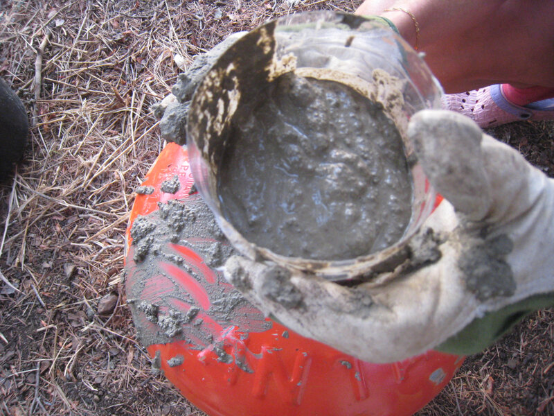 Et couler du mortier liquide dans la bouteille pour la lester.