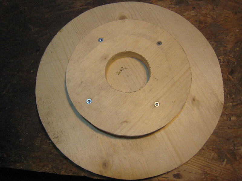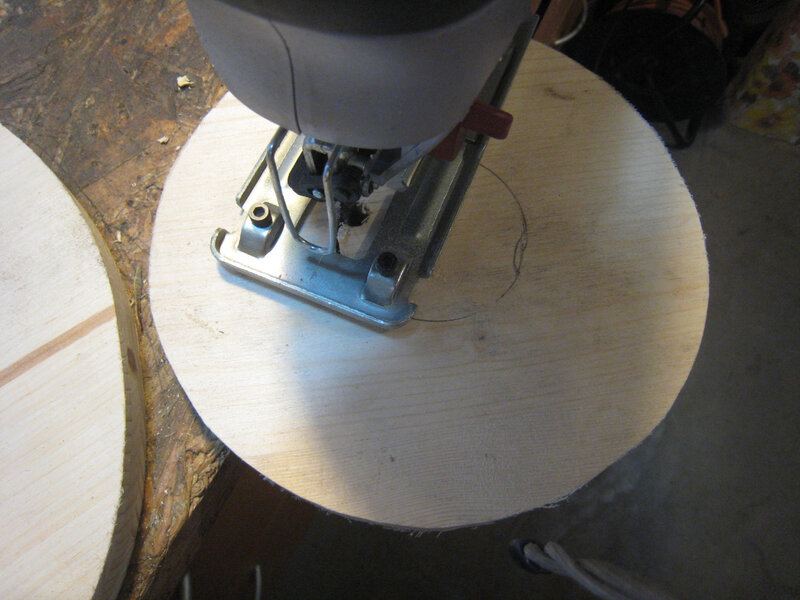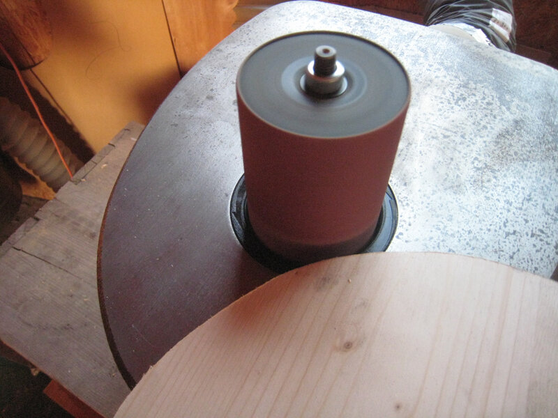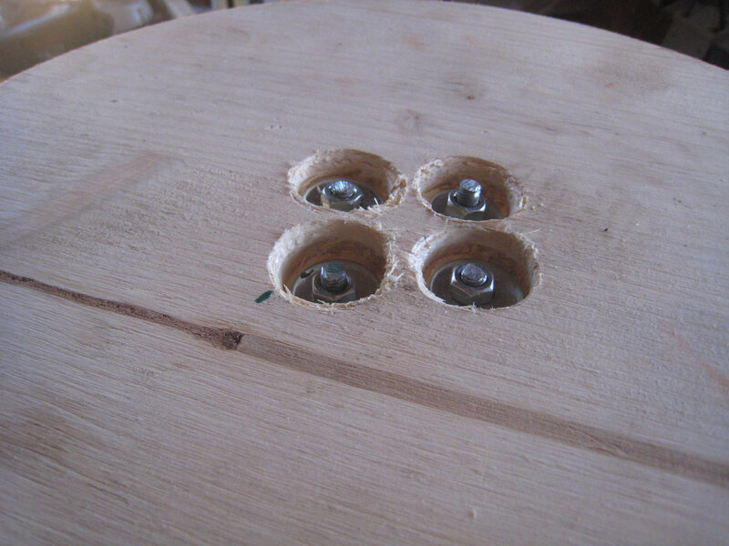 L’assise est constituée de 2 disques de contreplaqué, découpés à la scie à ruban, les chants sont poncés au tambour. Le disque inférieur est évidé au centre pour permettre de se centrer sur la bride. Il est solidarisé de l’assise.