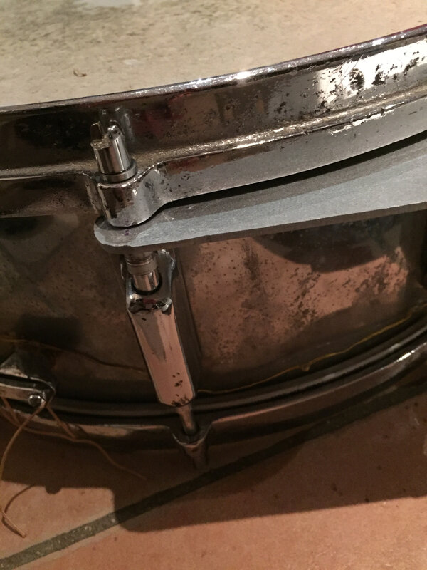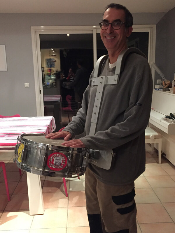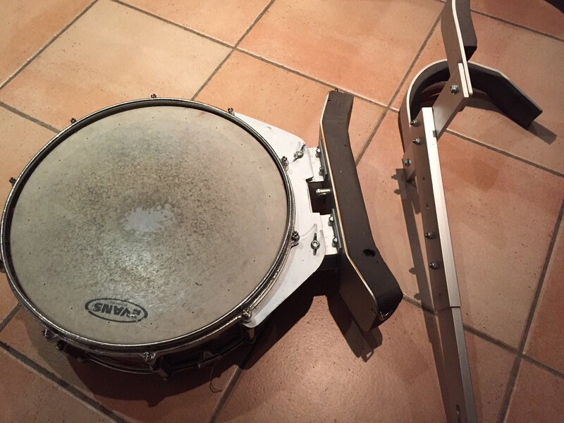 Je joue du saxophone basse dans une fanfare qui s »appelle Canebière Pression, et une fanfare cela peut déambuler. William qui nous a rejoins au printemps dernier a voulu récupérer un harnais pour y adapter sa caisse claire. Il a essayé de la fixer au harnais avec des mousquetons, mais ce n’était pas convaincant. A la répétition le mardi soir, il y a eu concours d’idées, chacun proposait son idée. Comme je suis aussi connu comme Olivierbricole à la fanfare et que j’ai un atelier, je me suis porté volontaire pour lui faire l’adaptation. Celà m’a pris une paire de soirs et voilà, c’était prêt pour la sortie à La Ciotat du samedi.
