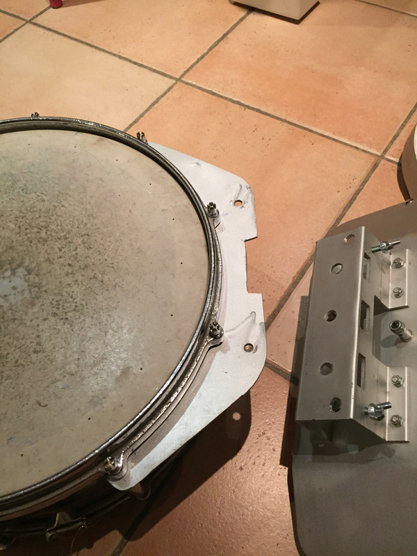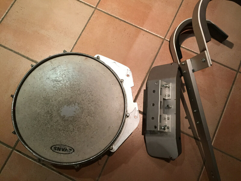 J’ai simplement créé une plaque métallique un peu épaisse qui se reprend sur 4 vis qui permettent de tendre la peau. J’ai ajouté des entretoises pour pouvoir serrer la plaque. Comme les vis sont situées sur un cercle, ces 4 vis permettent de bloquer la rotation de la plaque. Cette plaque est percée de 2 trous qui permettent de la lier au harnais. J’ai mis des boulons sur le harnais, et des écrous à oreille permettent d’assurer le montage tout en étant faciles à défaire à la main.